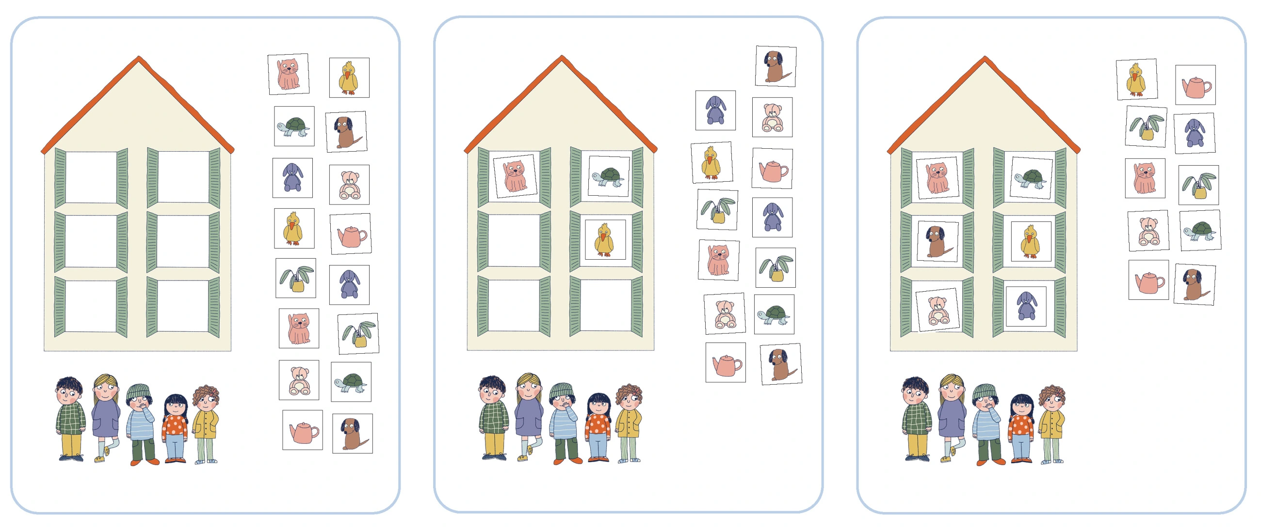 Zahrajeme si Kimovu hru s několika obrázky členů rodiny (pomůcka: STROM ŽIVOTA). Podle věku dětí zvolíme počet obrázků, které si mají zapamatovat. Nebo hrajeme variantu, kdy někdo z rodin zmizí. Pro starší děti můžete měnit rozložení členů rodiny.