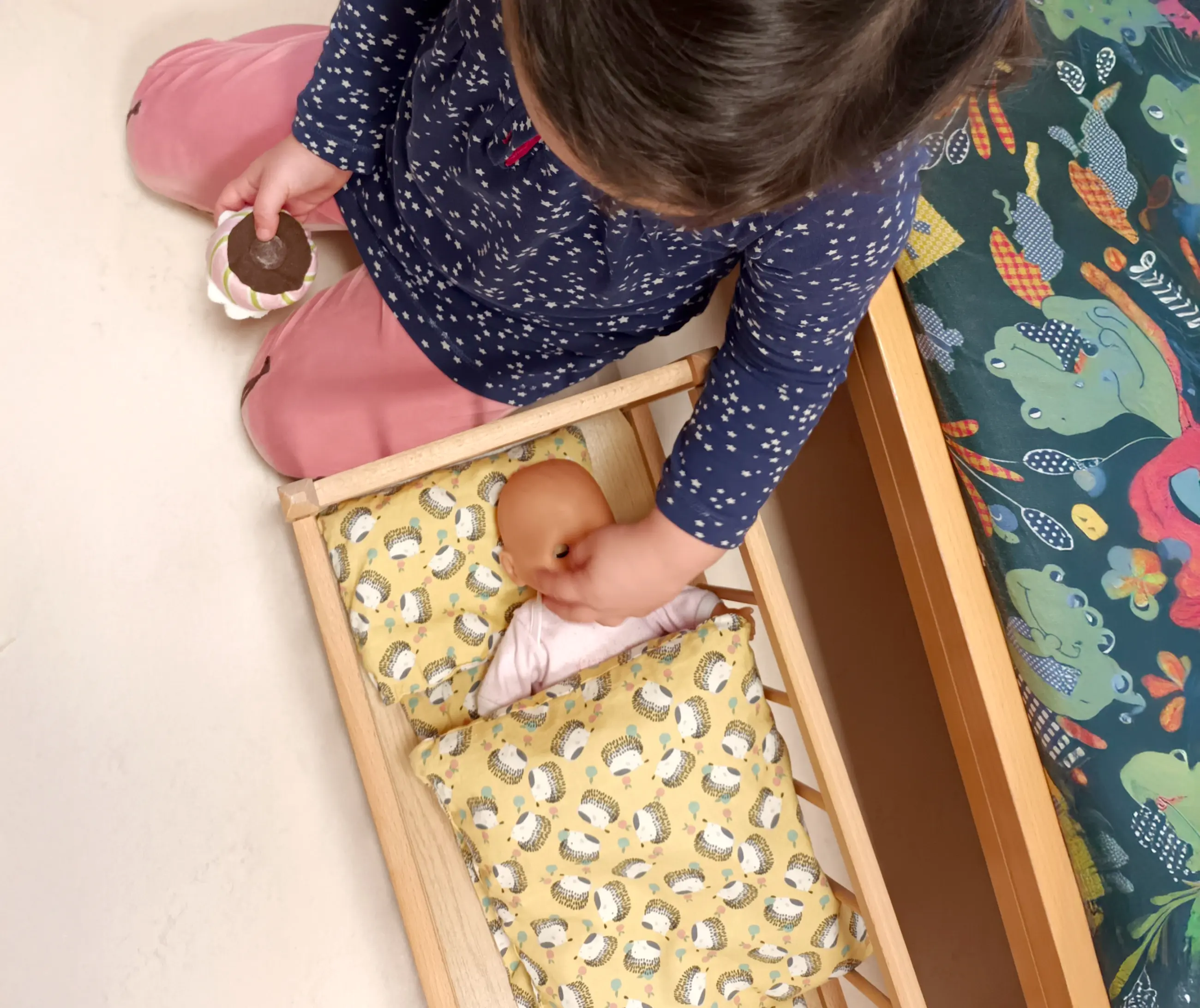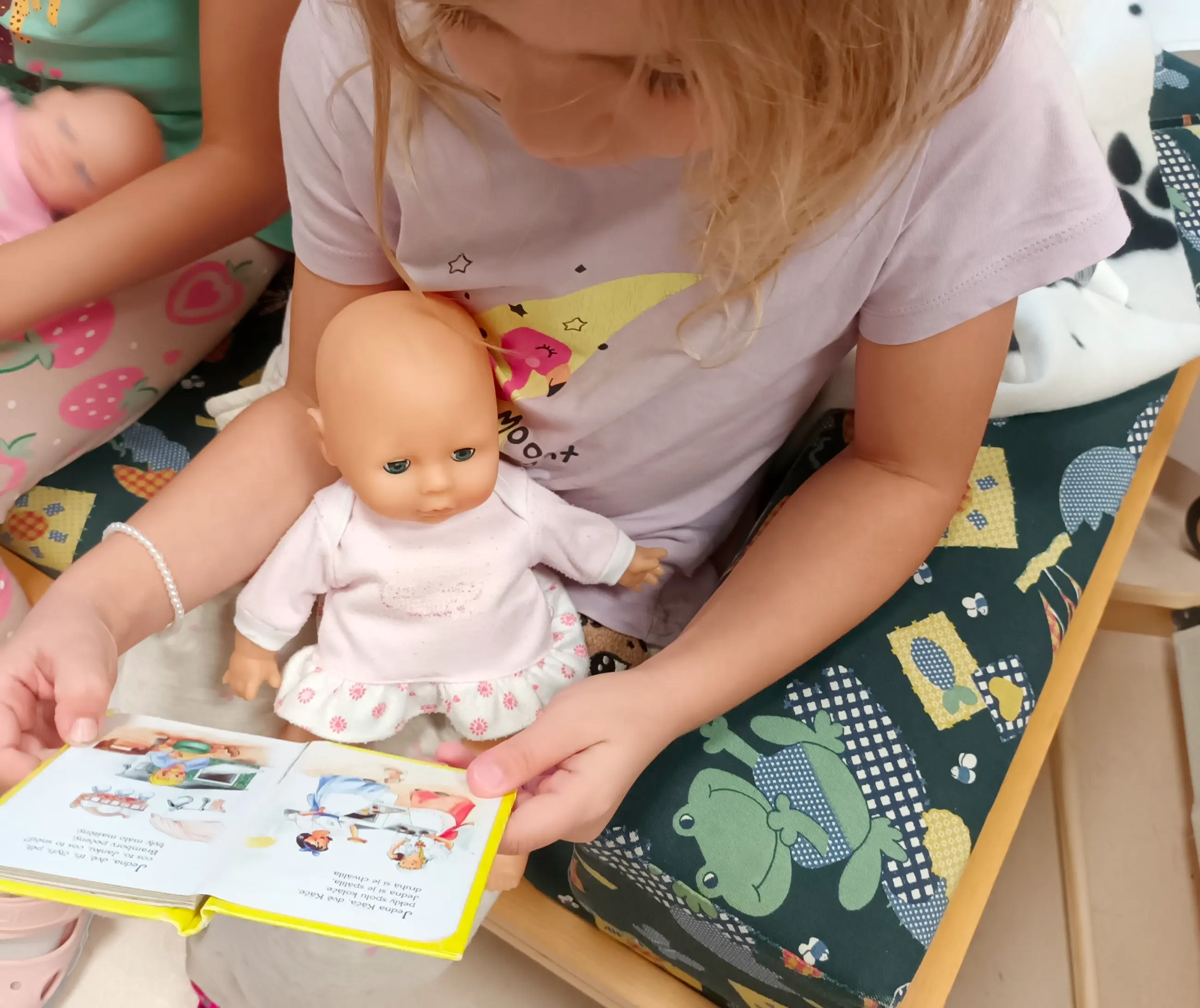 Nabídneme dětem možnost vyzkoušet si, jaké to je pečovat o miminka. Děti budou miminko oblékat, krmit, přebalovat, koupat nebo mu číst před spaním. Uspávání ukolébavkou nebo pohupováním v kočárku jistě také rády vyzkouší. Některé děti ve třídě mají doma mladšího sourozence, takže mají s péčí o malé děťátko zkušenosti, o které se mohou podělit například během společného kroužku nebo při práci v centru, kdy činnostmi provedou jiné děti. Role pečovatele je mezi dětmi velmi lákavá. Budeme potřebovat v domácnosti vytvořit pultík pro bezpečnou manipulaci s miminkem. Velmi hezkým doplňkem k této činnosti bude malý kočárek. Dále dětem připravíme panenky, vaničku, měkkou podložku na přebalování, oblečky pro miminka, napodobeniny nebo reálné obaly od kosmetiky pro miminka, lahvičky na mléko, bryndáček, žínku, plenky, …atd. Zkrátka cokoliv, co dětem přiblíží a pomůže napodobit nejrůznější úkony, které běžně dělají maminky při péči o malá miminka. Přečteme si s dětmi knížku Když jsme spolu.
