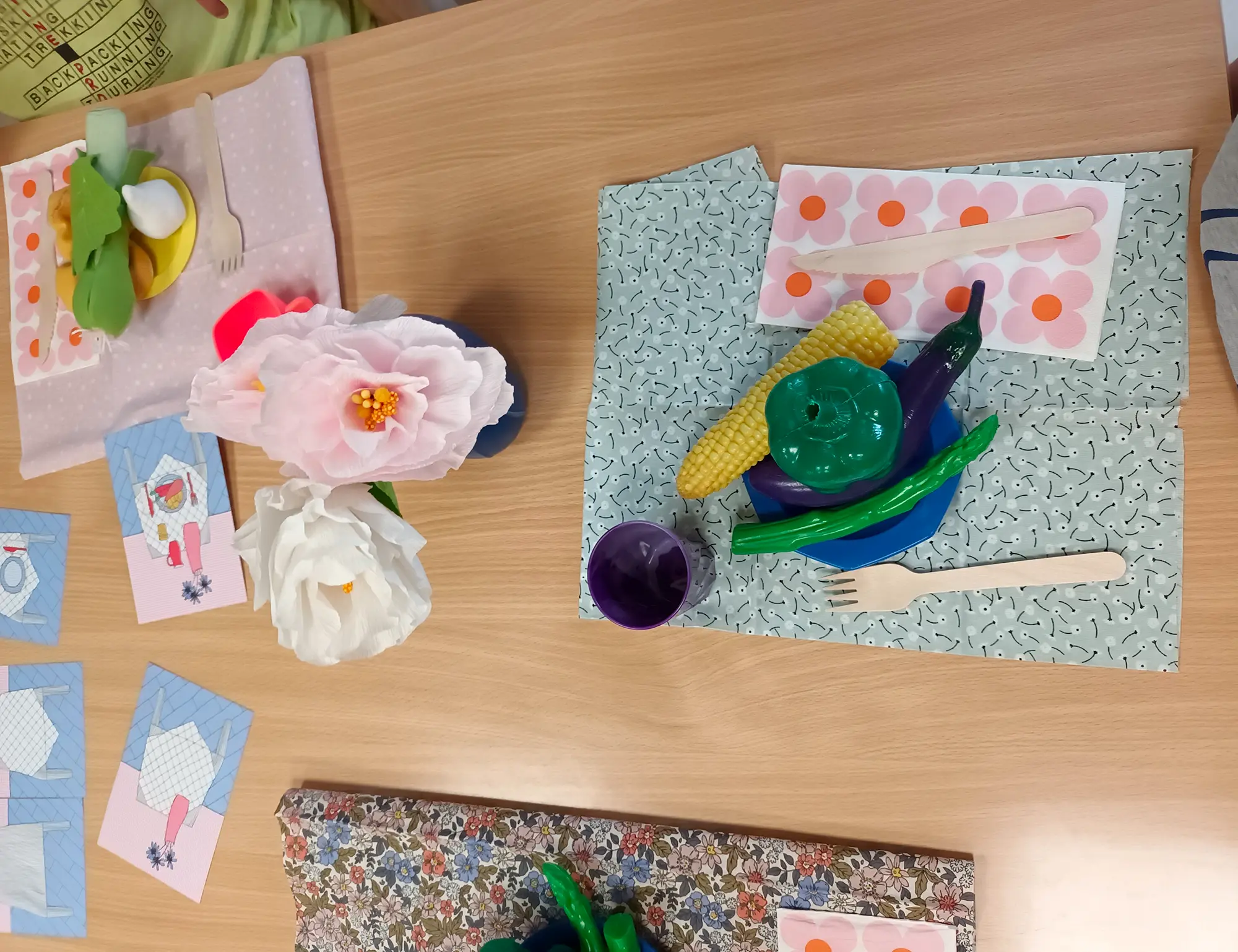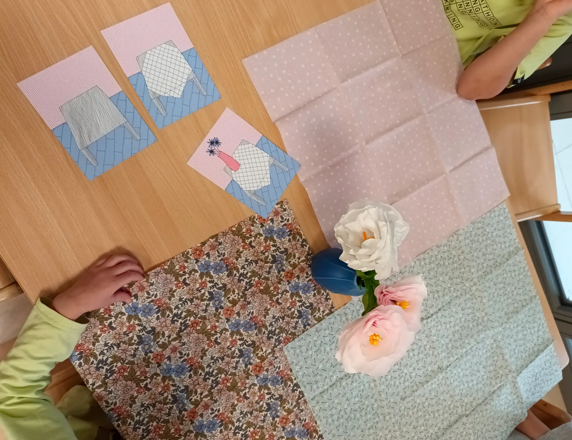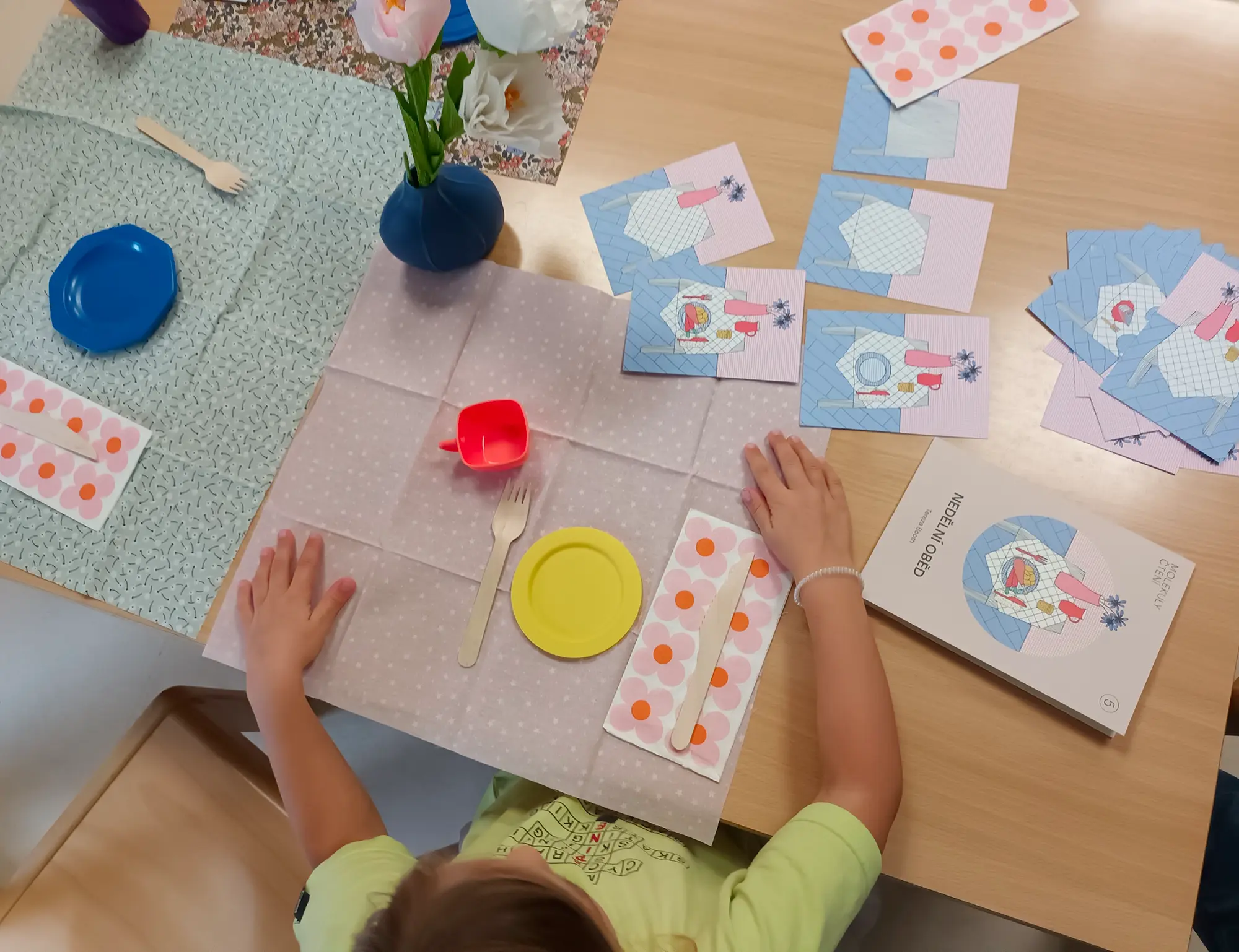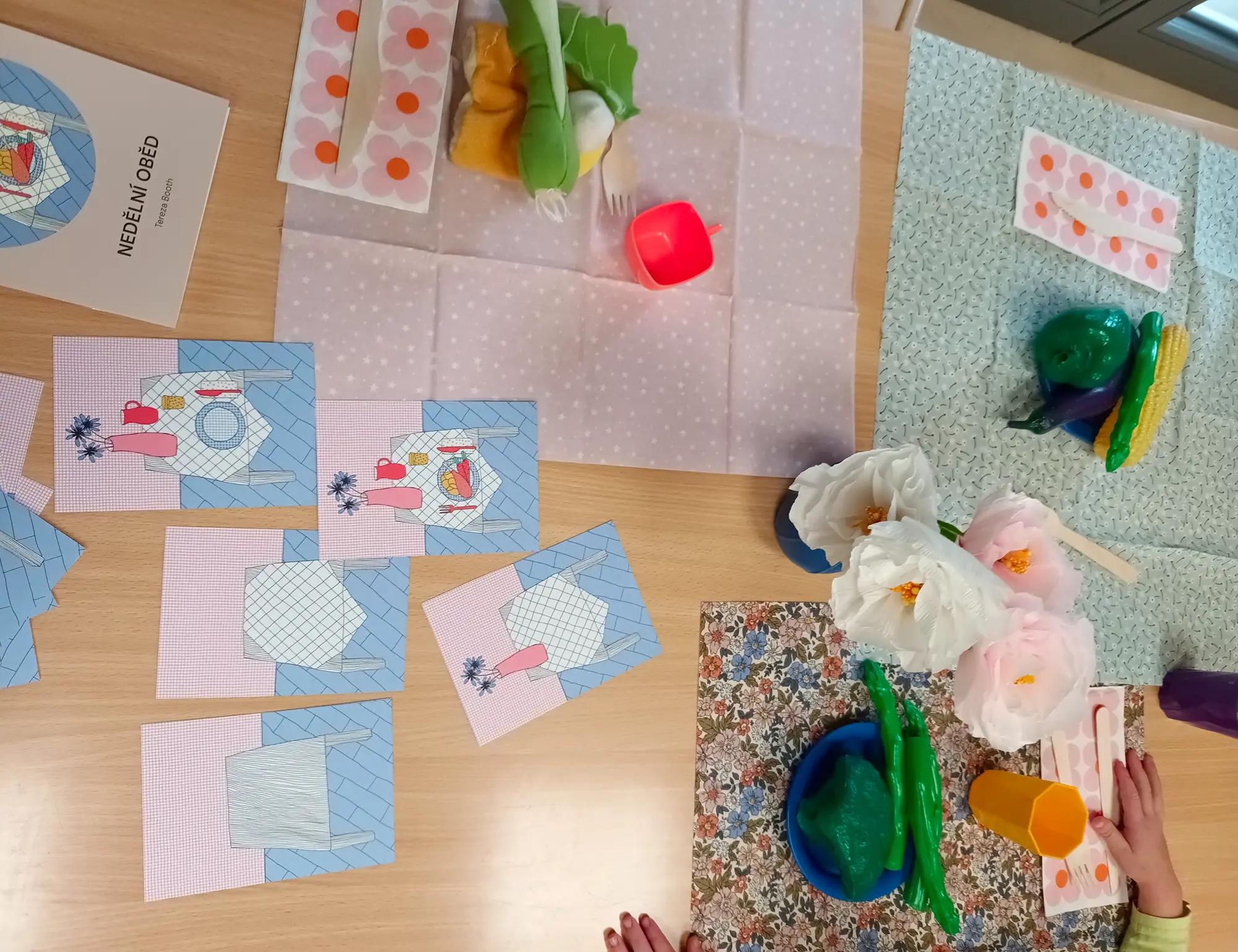 Dětem nabídneme možnost naučit se, jak správně prostřít stůl a připravit ho pro společné stolování. Na začátku si přečteme knížku Nedělní oběd, která nás zavede do atmosféry rodinného setkání u stolu. Povídáme si o tom, proč je společné jídlo s rodinou důležité, že je to chvíle, kdy si můžeme popovídat, podělit se o zážitky a být spolu. Společně se zamýšlíme nad tím, jak takové chvíle přispívají k dobré náladě a vzájemné blízkosti. Navážeme rozhovorem o etiketě stolování – jak se u stolu chováme, proč sedíme rovně, proč nemluvíme s plnými ústy, jak si předáváme jídlo a proč je hezké poděkovat. Děti přemýšlejí, jaké chování dělá stolování příjemným pro všechny a jak se takové dovednosti mohou hodit i v jejich dalším životě. Poté si společně vysvětlíme, jak správně prostřít stůl. Ukážeme si, kam položit talíř, příbory, ubrousek, sklenici a jak stůl doplnit o dekoraci. Následně si zkusíme prostřít několik stolečků, například ve skupinkách. Dětem nabídneme různé pomůcky jako jsou příbory, nádobí, prostírání, ubrousky i drobné dekorace, ze kterých si mohou vybrat a podle svého nápadu připravit stůl. Každá skupinka může vytvořit trochu jinou tabuli – slavnostní, rodinnou nebo třeba obyčejnou každodenní. Nakonec si společně projdeme všechny prostřené stoly, pozorujeme, jak se liší, co děti zaujalo na práci ostatních a jak každý stůl působí – jestli spíš slavnostně, útulně nebo jednoduše a domácky. V centru si pak děti samostatně zkouší prostírání podle vlastního nápadu nebo podle připraveného vzoru z pomůcky NEDĚLNÍ OBĚD. Děti si také mohou podle své fantazie vyrobit vlastní prostírání z papíru, látek nebo fólie.