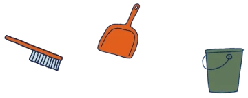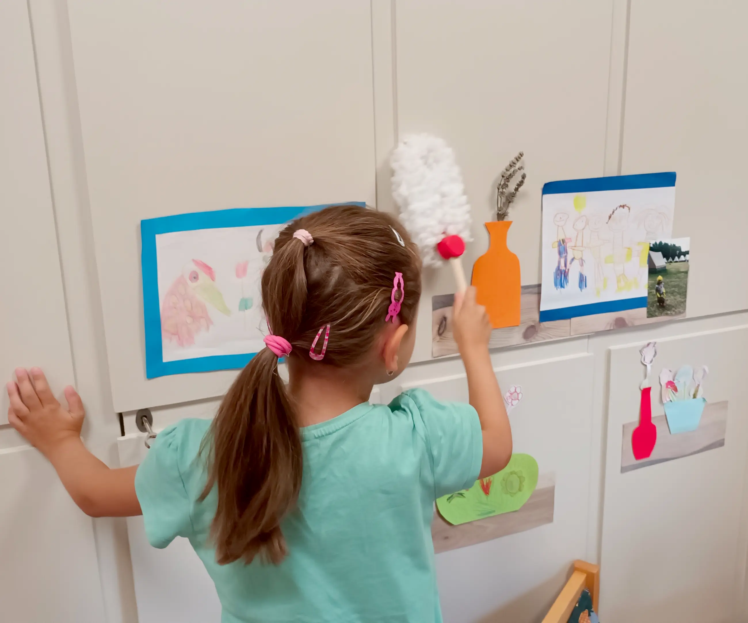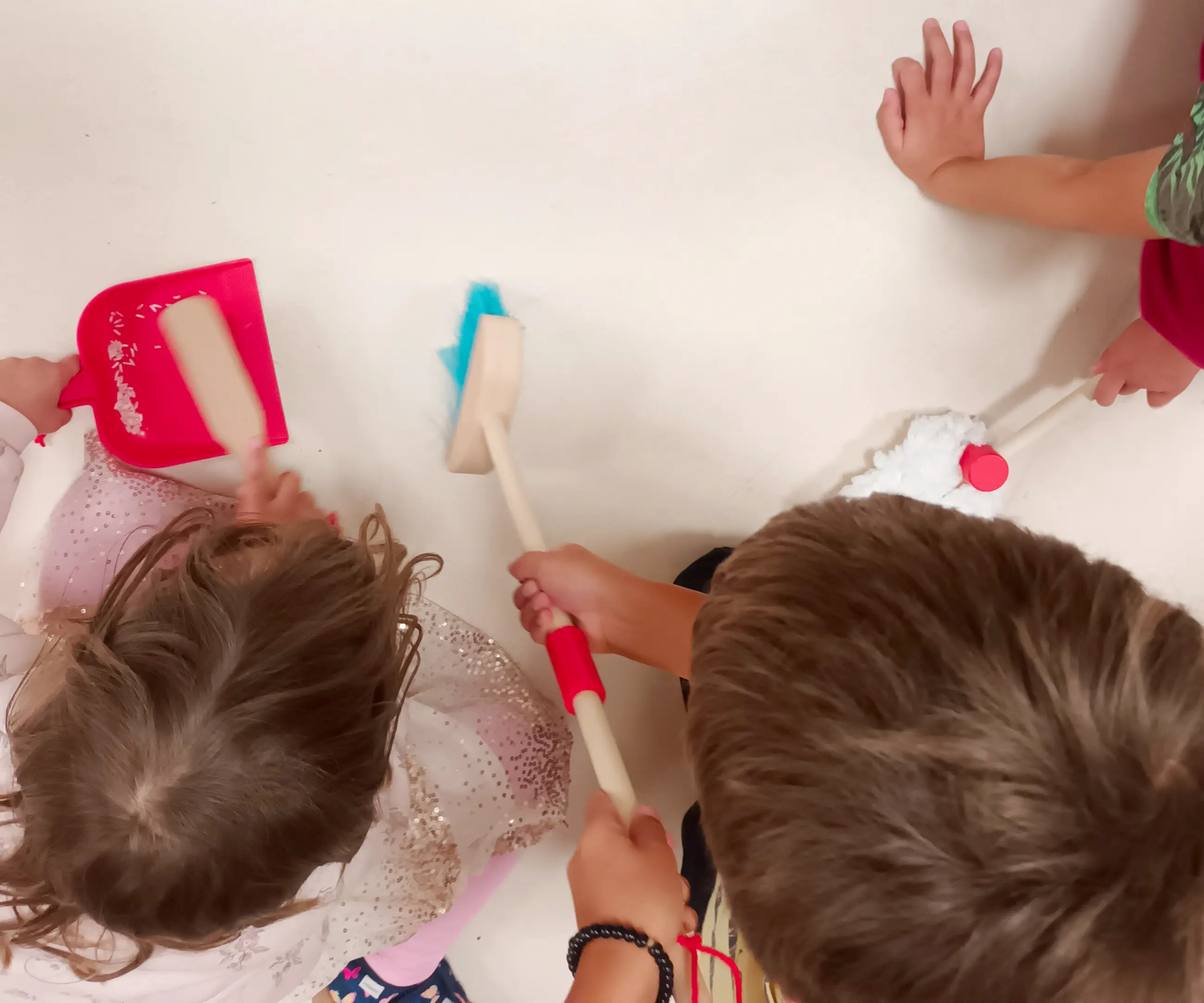 Domácnost je vybavena sadou pomůcek na úklid, tedy předměty, které dětem pomohou udržet pořádek, ale které jsou přizpůsobené výšce dítěte předškolního věku. Měly by vypadat realisticky a opravdu fungovat. Sada může obsahovat smetáček a lopatku, kbelík, hadřík, houbičku nebo i stojan, na kterém je vše zavěšené. Důležité je, abychom dětem předvedli, jak a kdy jednotlivé věci používat. Využití úklidové sady by mělo přesahovat rámec centra a děti by ji měly mít možnost používat i při “nehodách“ během jídla nebo během hraní. Nesmíme zapomenout, že úklidové prostředky potřebují po použití také očistit, vyždímat či vyschnout. I tuto fázi úklidu dětem předvedeme a poskytneme prostor, aby mohly proces úklidu skutečně dokončit a našly například vhodné místo, kam při své výšce pověsit mokrý vyždímaný hadřík. Malý dětský sušák je pro tyto účely ideální, pokud máte dostatek místa.