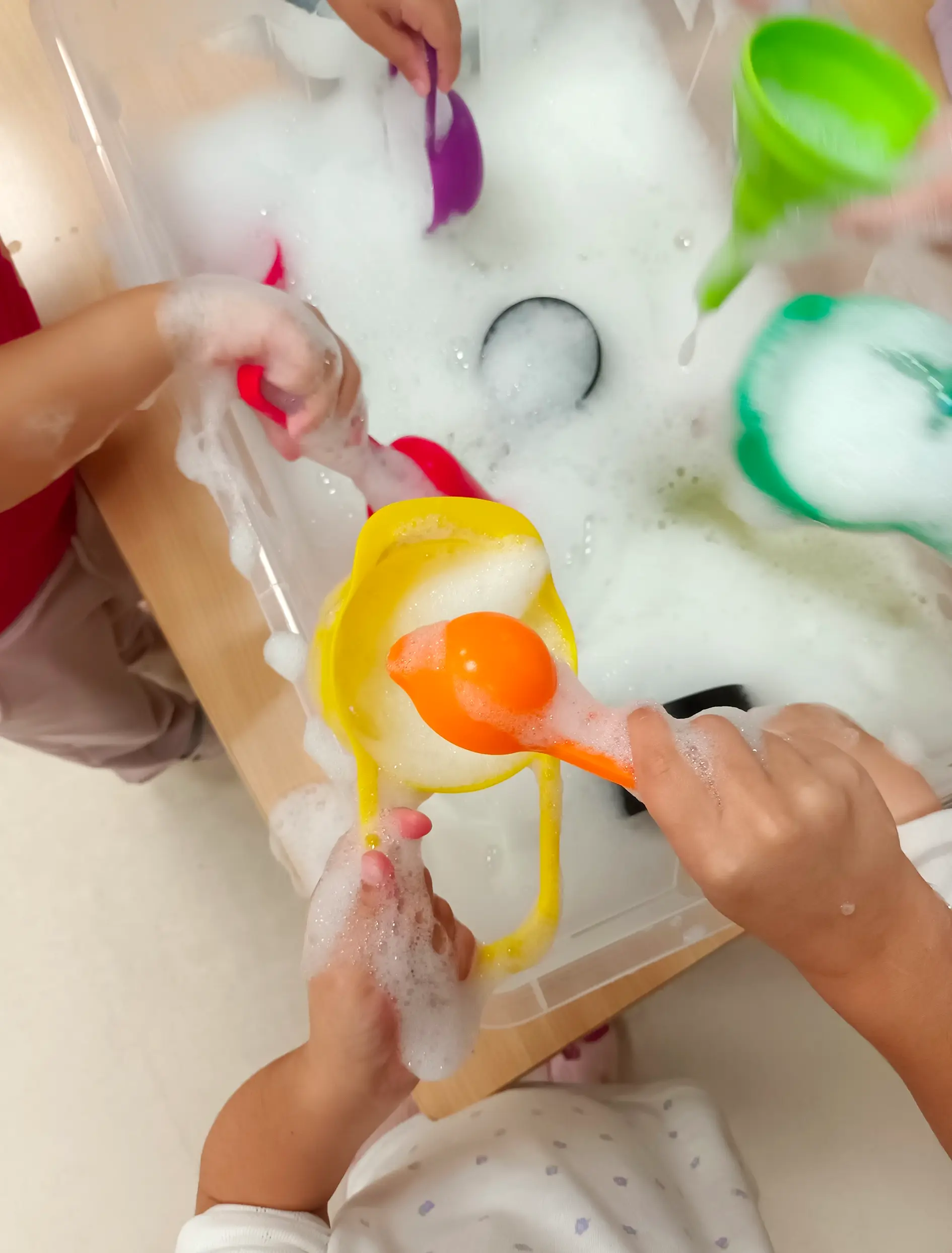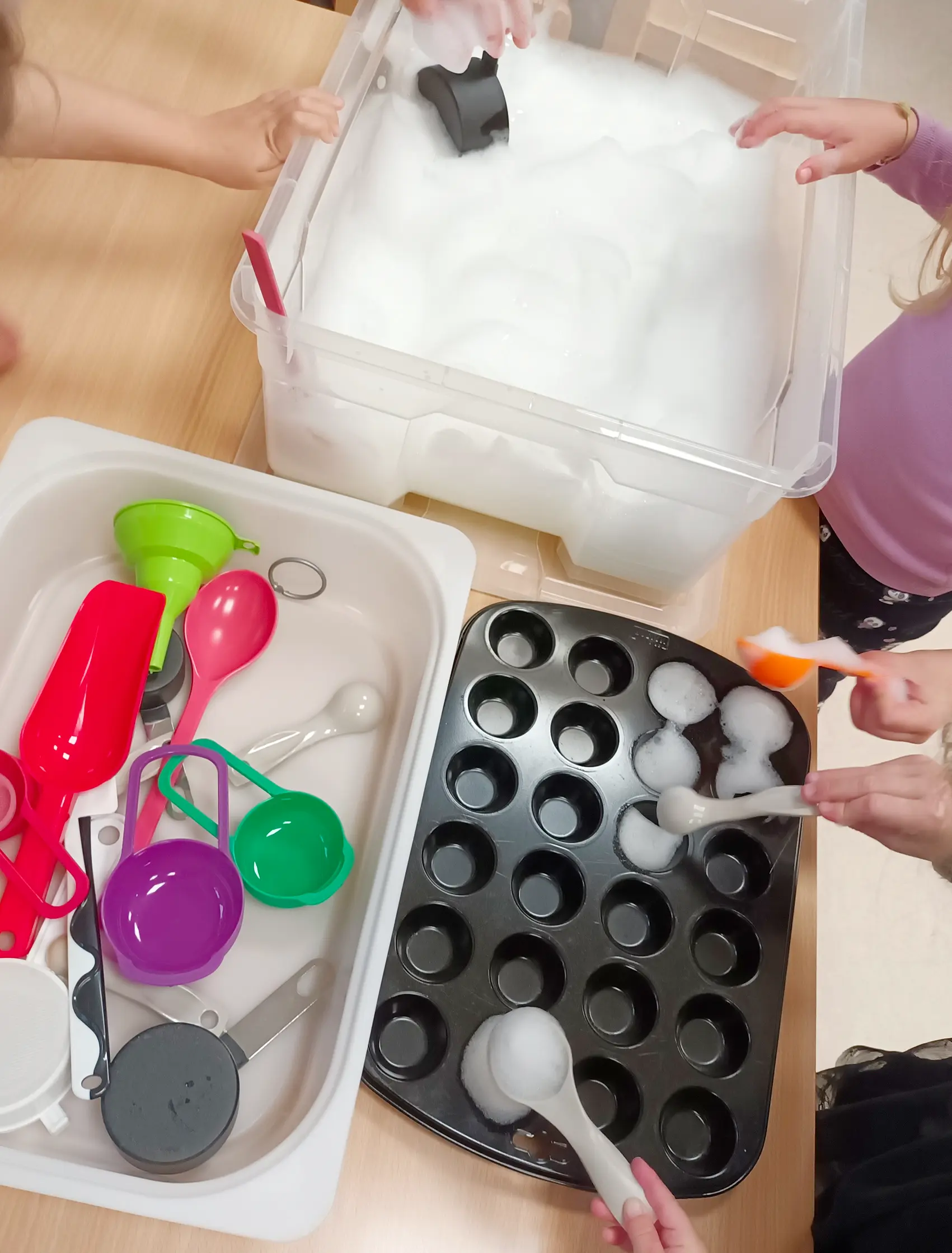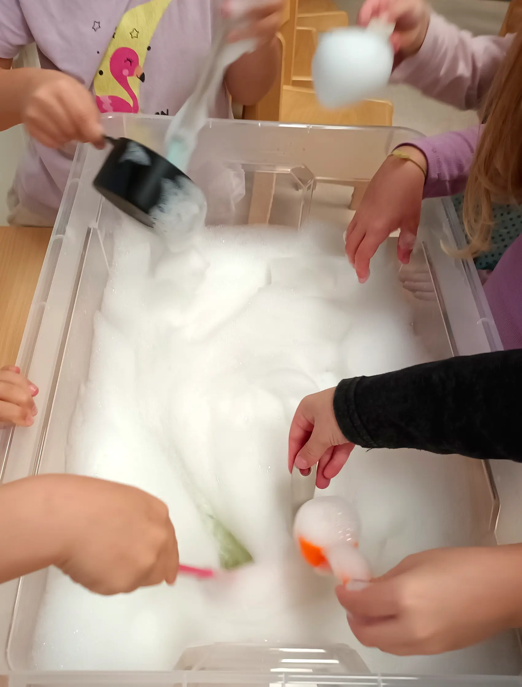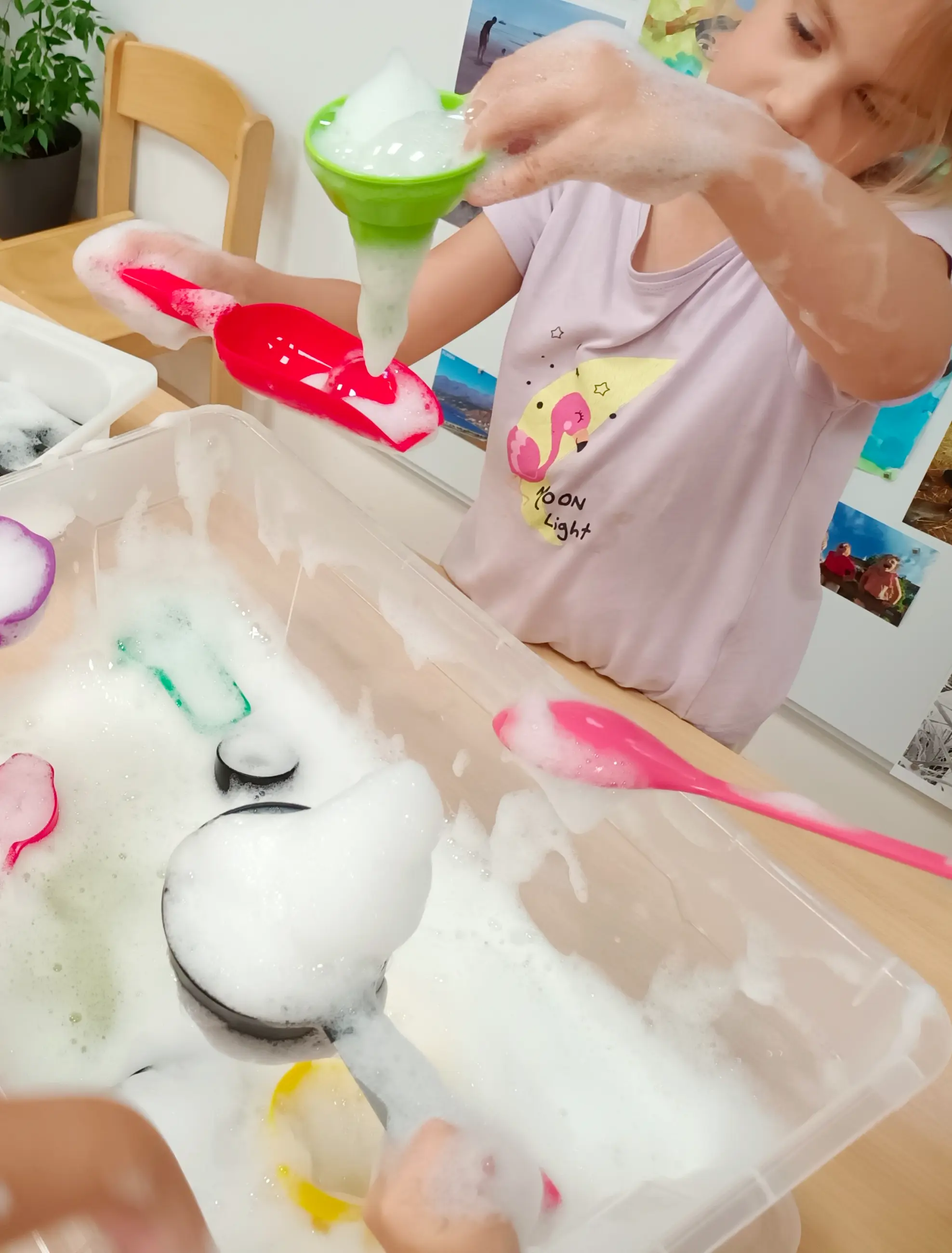 Činnost rozvíjí smyslové vnímání, představivost a tvořivost. Děti se učí experimentovat, pozorovat změny a vyvozovat souvislosti. Posilují jemnou motoriku a koordinaci pohybů při nabírání a přelévání pěny. Aktivita zároveň podporuje vnímání čistoty, hygienických návyků a bezpečné manipulace s vodou a mýdlem.