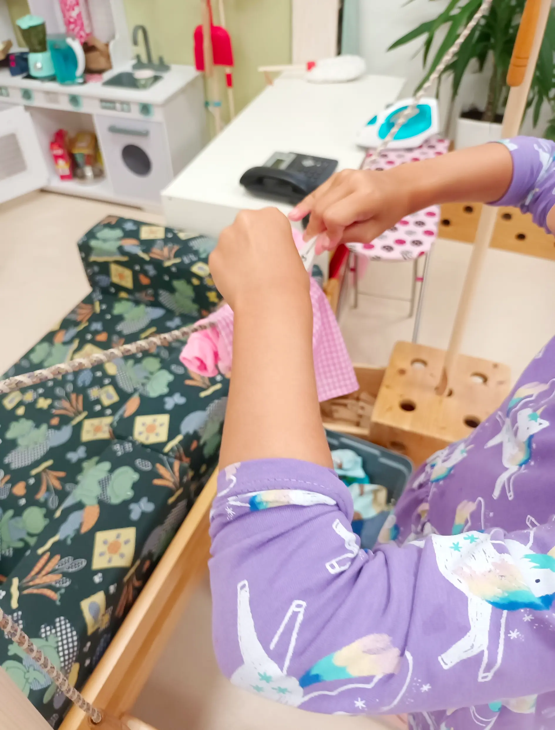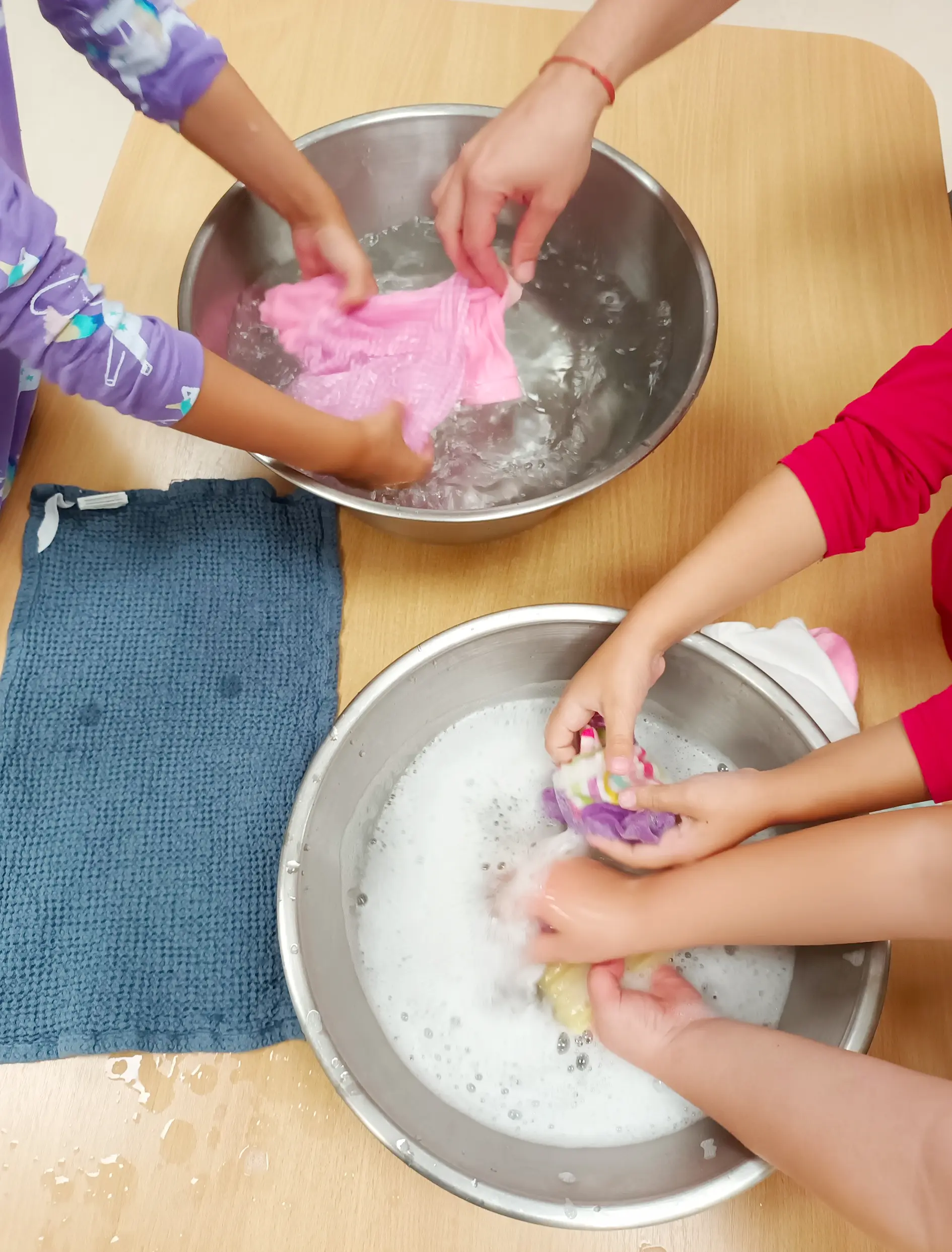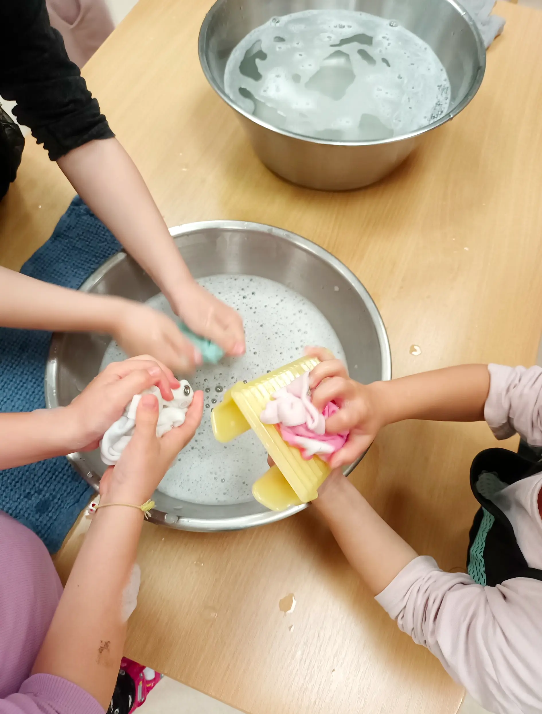 Navazujeme na společnou činnost a četbu knihy Velké prádlo. Povídáme si o tom, že mít své oblečení v pořádku není jen hezké na pohled, ale pomáhá nám se cítit se dobře a pohodlně. Děti sdílejí, kdo u nich doma pere prádlo a jak pomáhají. Ukážeme si, jak se pralo/pere ručně pomocí valchy, teplé vody a mýdla. Děti si mohou valchu prohlédnout, vysvětlíme si, jak funguje, a povídáme si o tom, že dříve bylo praní náročnou prací, zatímco dnes nám ji usnadňují moderní přístroje. Než začneme s praním malých kousků prádla z domácnosti jako jsou třeba látkové ubrousků nebo oblečení na panenky, prohlédneme si postup ručního praní s pomůckou RUČNÍ PRANÍ. Poté pereme v teplé vodě s trochou mýdla, třeme látku o látku, nebo použijeme valchu. Dále prádlo pečlivě vymácháme ve studené vodě a co nejlépe vyždímáme. Nakonec jej pověsíme pomocí kolíčků na připravenou šňůru. Dětem připomeneme, že s vodou pracujeme opatrně a že je potřeba dávat pozor na mokrou podlahu. Plakátek ručního praní mají děti vyvěšený v centru, aby mohly samostatně opakovat jednotlivé kroky: praní, máchání, ždímání a věšení prádla.