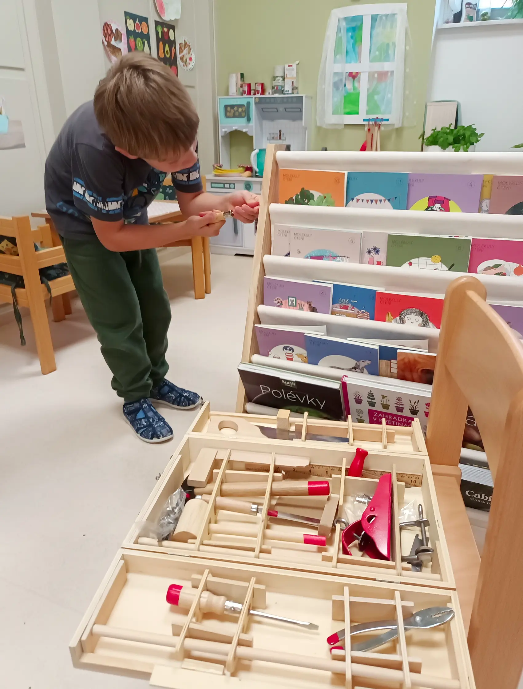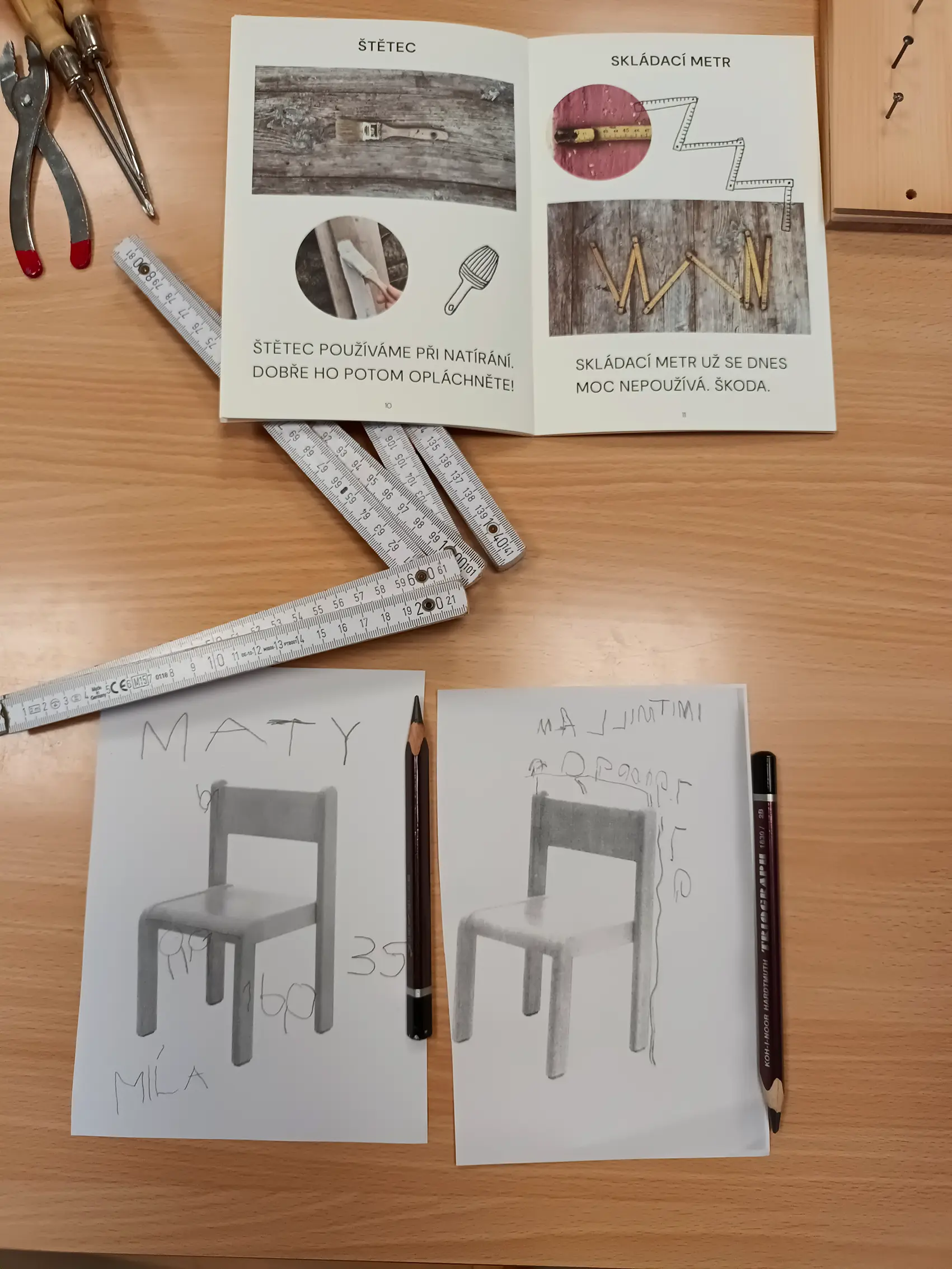 Práce s nářadím v tomto bloku je velmi lákavá. Pracovní plocha ponku je omezená, proto ukážeme dětem činnosti, které mohou s nářadím vykonávat i mimo něj. Kromě dotažení nejrůznějších šroubků budeme měřit a porovnávat. Porovnáme skládací metr s krejčovským a zkoušíme měřit různé předměty ve třídě. Pozorujeme, že oba měří stejně, i když vypadají jinak a používají se odlišným způsobem. Děti zjišťují, na co se který metr hodí víc, co nelze měřit skládacím metrem, jak velké jsou věci, které denně používáme. Děti si o měření tvoří své vlastní záznamy. Pomůcky k využití v této části jsou: CO K SOBĚ PATŘÍ - NÁŘADÍ, KOLIK CO MĚŘÍ a NAJDI V ŘADĚ ROZDÍL - NÁŘADÍ. Pokud by někomu bylo téma nářadí příliš vzdálené, použijeme variantu NAJDI V ŘADĚ ROZDÍL - NÁDOBÍ.