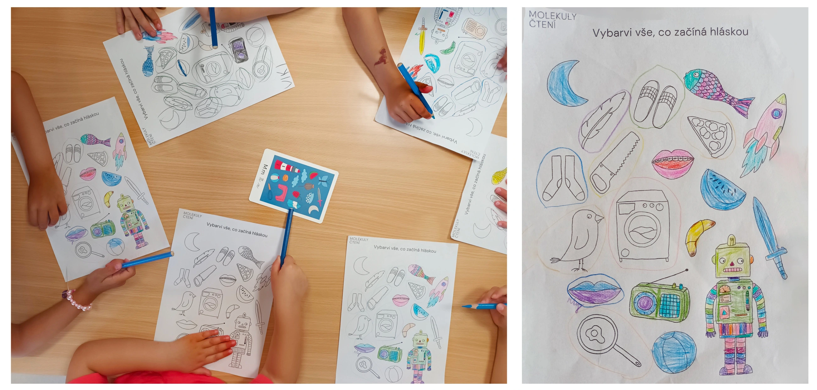 S dětmi vypracujeme pracovní list. Pojmenujeme a vybarvíme modře všechny obrázky začínají hláskou M (pracovní list - CO ZAČÍNÁ NA... R, P, M).