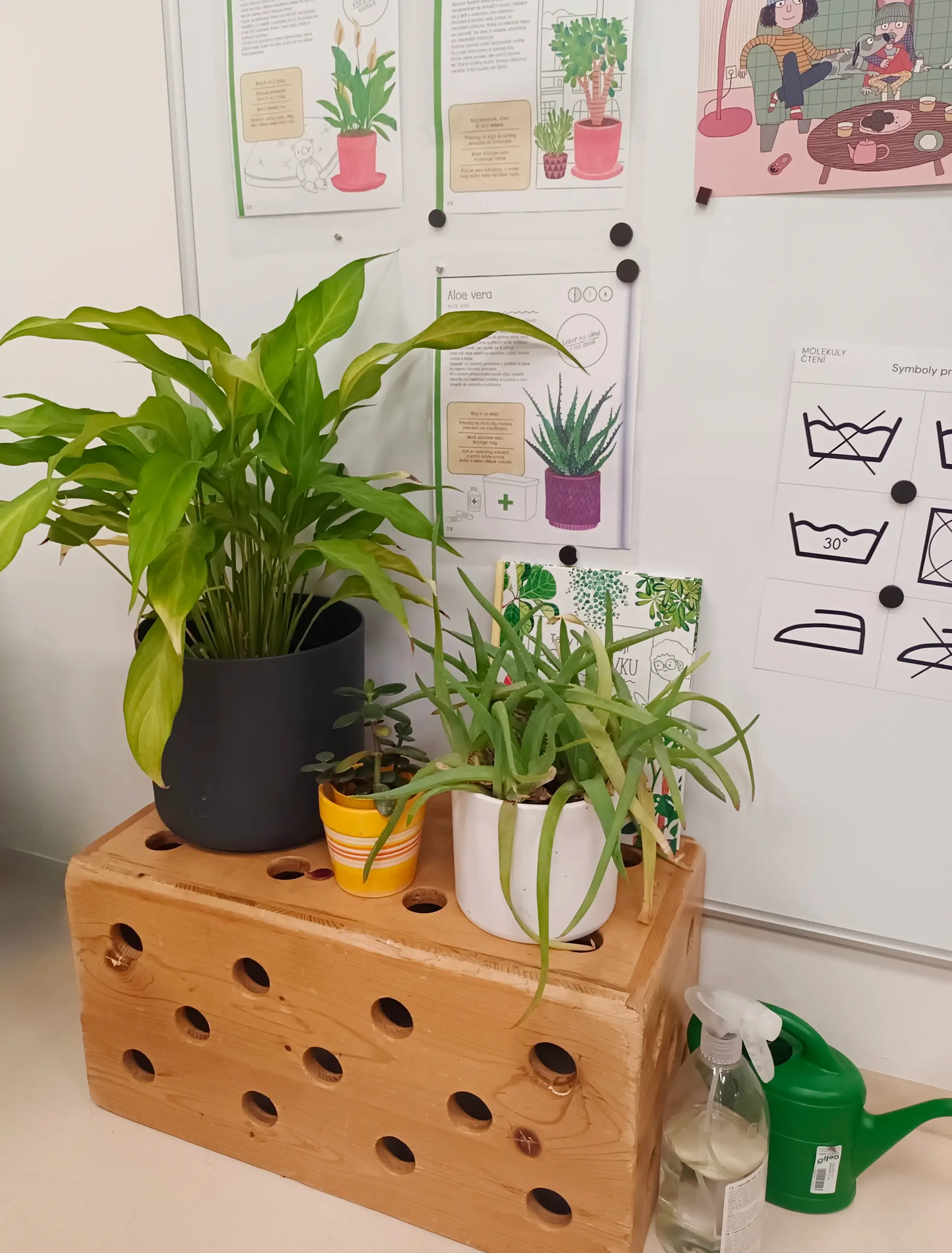 Vybereme vhodné pokojové rostliny, které přineseme do centra. Na každý květináč s rostlinou připevníme kartičku se jménem rostliny spolu s instrukcemi, jak o ni pečovat. S dětmi si novinku v centru ukážeme, vysvětlíme si význam, jaký mají pokojové rostliny v našich obydlích, proč je pěstujeme. Naše nové rostliny pojmenujeme, vysvětlíme si, co budou od nás ke spokojenému růstu potřebovat a umístíme plakátek PÉČE O ROSTLINU. Tyto úkony si pak mezi sebou rozdělíme jako služby. Nyní můžeme dětem rozdat předem připravený nadepsaný záznamový list o rostlinách. Je na nás, jak tento list pojmeme, zda bude věnován pouze jedné konkrétní rostlině nebo pokojovým rostlinám všeobecně. V záznamovém listu můžeme v čase zapisovat četnost zalévání, kondici rostliny, její růst apod. Nebo můžeme společně vytvořit pro každou rostlinku arch s informacemi o tom, jaký druh péče jí svědčí, jaké stanoviště potřebuje, aby prospívala. Zdrojem informací bude naše pozorování, encyklopedie a příručky pro pěstitele. V rámci tohoto tématu můžeme využít například tituly: Také mám svou pokojovku, Ruce v hlíně, Porozuměj řeči rostlin, Malý zahradník. Pozorování rostlin je časově náročnější, a proto si rostlinky ve třídě ponecháme i po změně námětu centra a pokračujeme v péči o ně. Nenáročnou rostlinou, která je zároveň svým vzhledem velmi atraktivní, je řasokoule. Vyprávění o pokojových rostlinách obohatíme právě ukázkou této zajímavosti, kterou si děti mohou i osahat v dlaních, pohrát si s ní a dozvědět se o tom, co potřebuje k životu a v čem se liší od běžných „pokojovek“. S dětmi přemýšlíme, proč jsou rostliny naší domácnosti užitečné, a vyzkoušíme pokus, na kterém si předvedeme, jak rostliny uvolňují vodu.