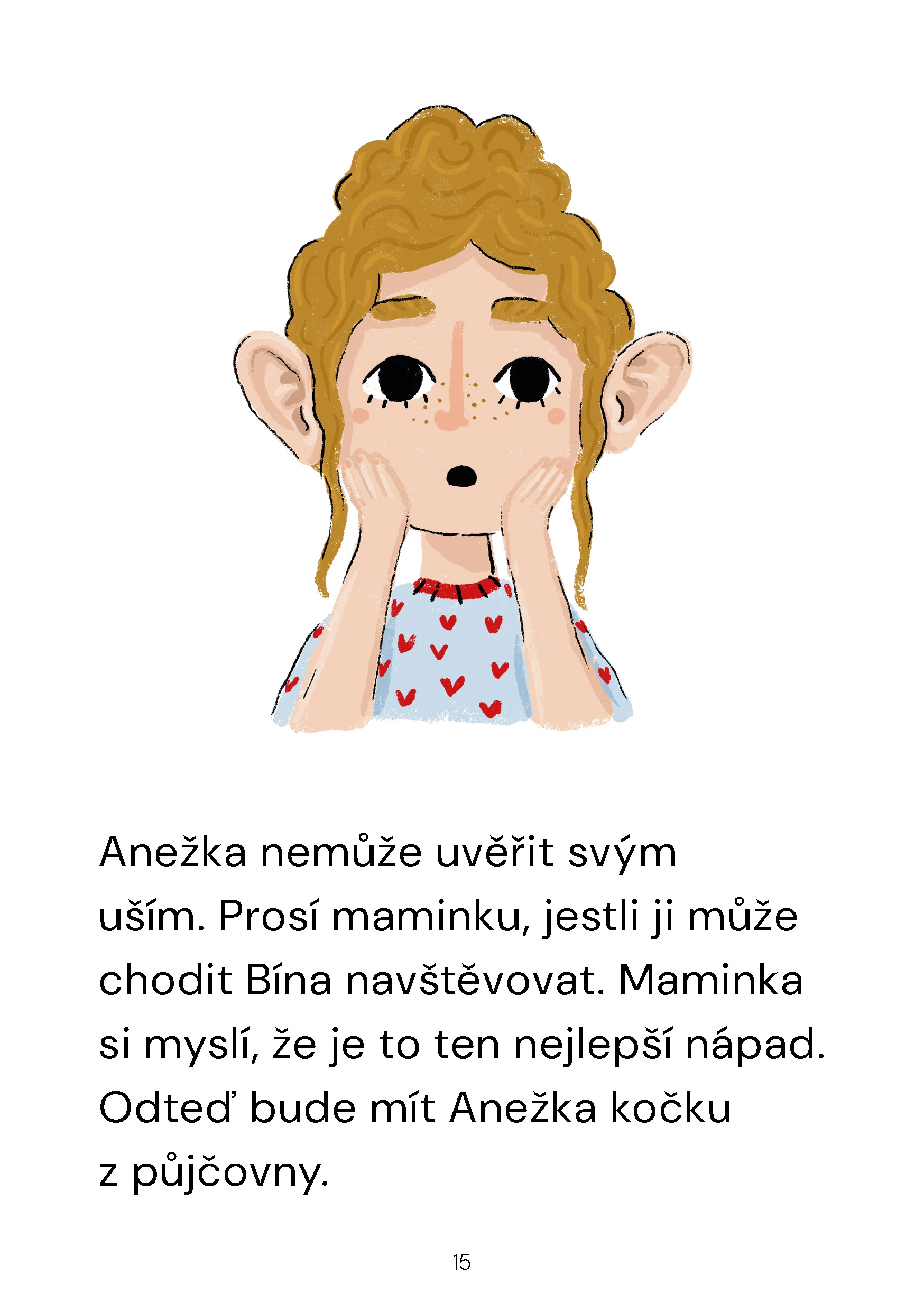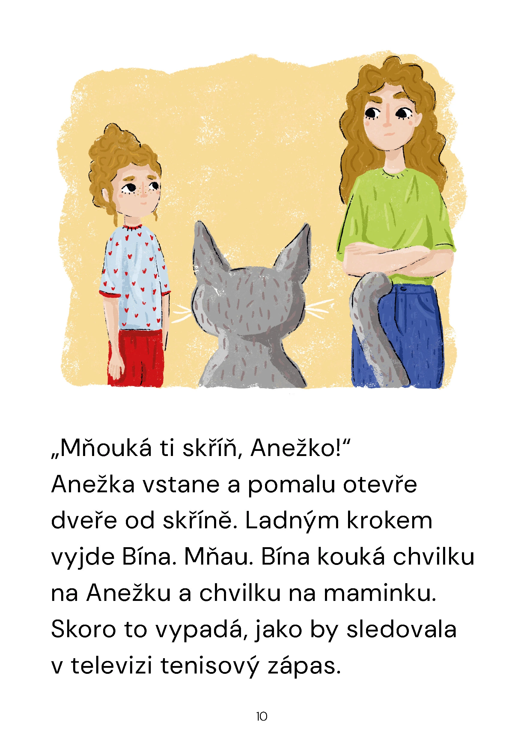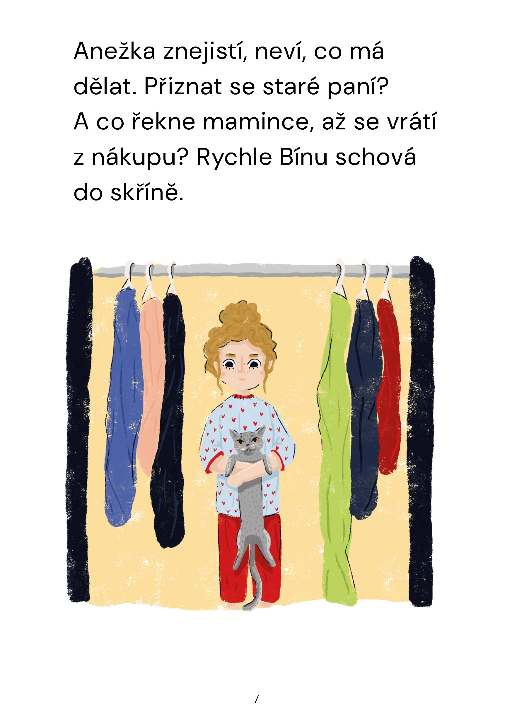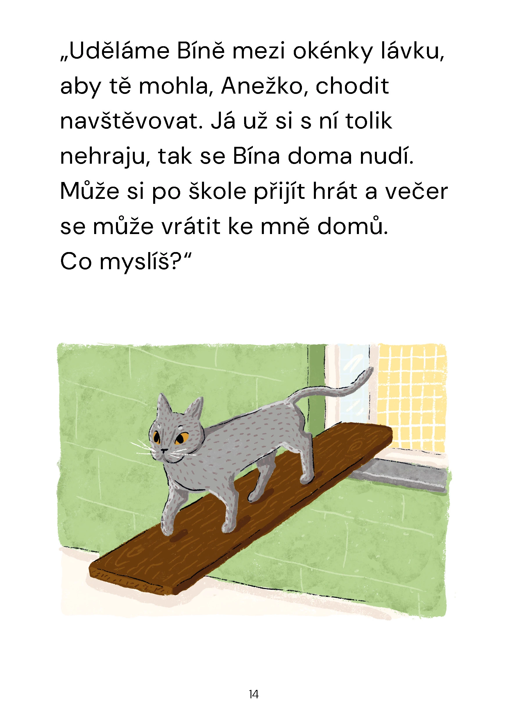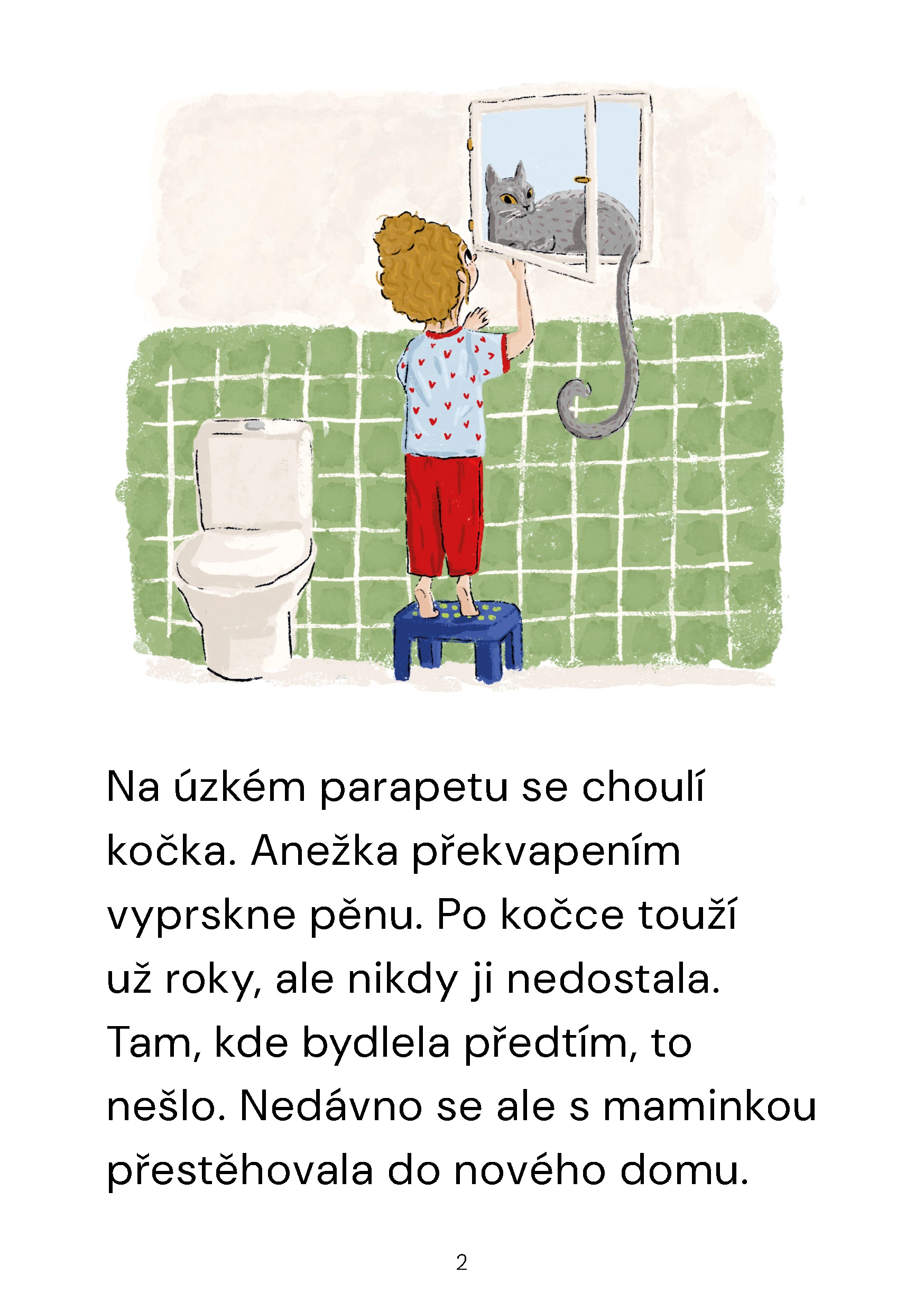 Anežka touží po kočce. Zrovna se s maminkou přestěhovaly a kočka by byla doma pořád sama. Když si večer čistí zuby, ozve se jí nad hlavou mňoukání. Anežka si přisune k okénku stoličku a na parapetu najde schoulenou kočku. Že by se Anežce splnil sen?