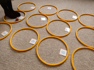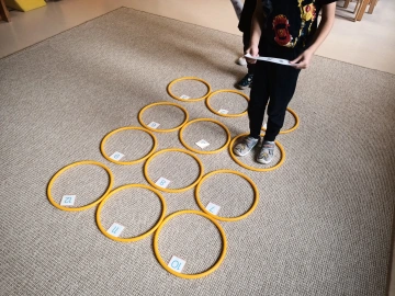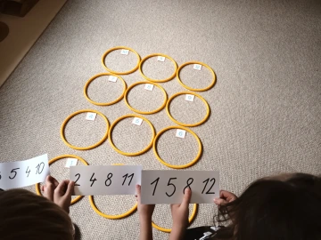 K této aktivitě potřebujeme nejprve na zem rozestavit několik řad obručí a do každé umístit číselnou kartu. Děti dostanou kartu, na které bude několik čísel - tedy trasa, pomocí které děti projdou cestu obručemi. Děti prochází jednu obruč za druhou, vždy vkročí do té obruče, jejíž číslo je na řadě a shoduje se s číslem, které jsme zadali v trase.