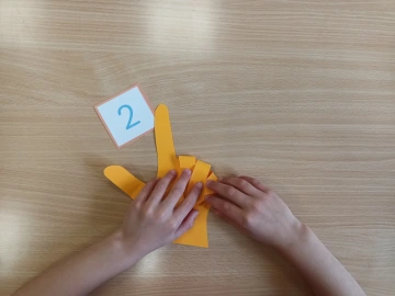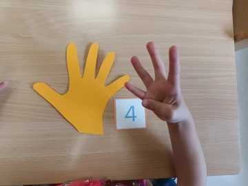 Na barevný papír obkreslíme ruku a vystřihneme. Papírovou ruku připevníme k podložce lepící gumou tak, aby prsty zůstaly volné k manipulaci. Číselné karty jsou na sobě, ne v pořadí. Dítě bere kartu za kartou a její hodnotu znázorní tím, že ohne několik volných papírových prstů. Prsty, které zůstanou neohnuté, symbolizují počet odpovídající číslu na kartičce.