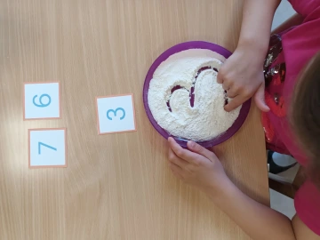 Skvělou přípravou na psaní číslic je kreslení prstem v sypkém materiálu jako je mouka nebo krupice. Ukážeme si správný směr a místo, od kterého začít s kresbou tvaru.