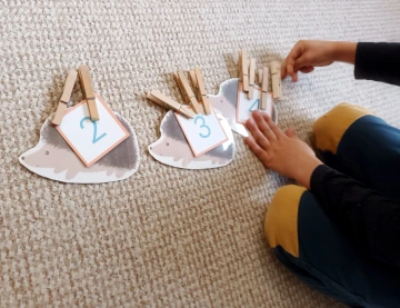 Kolíčky pomáhají dětem s procvičením jemné motoriky a posílením jemných svalů na rukou. Číselné kartičky se mohou dočasně připevnit k jakémukoli obrázku (např. lepicí gumou), nebo můžeme použít přímo karty samotné. Děti mají za úkol dle číslice na kartě připnout správný počet kolíčků k obrázku.