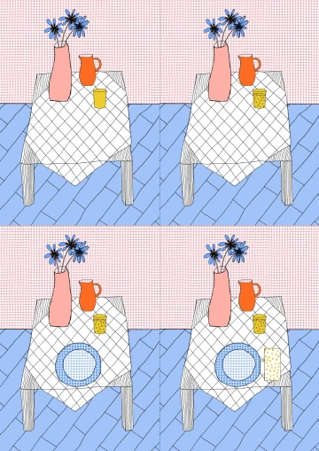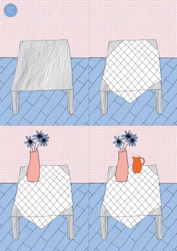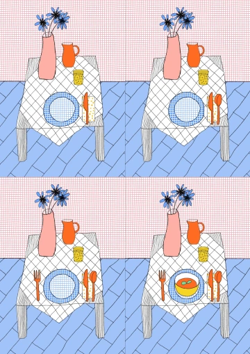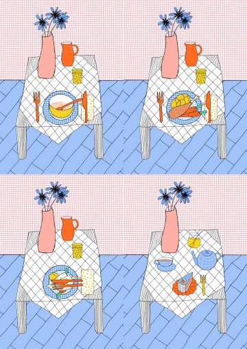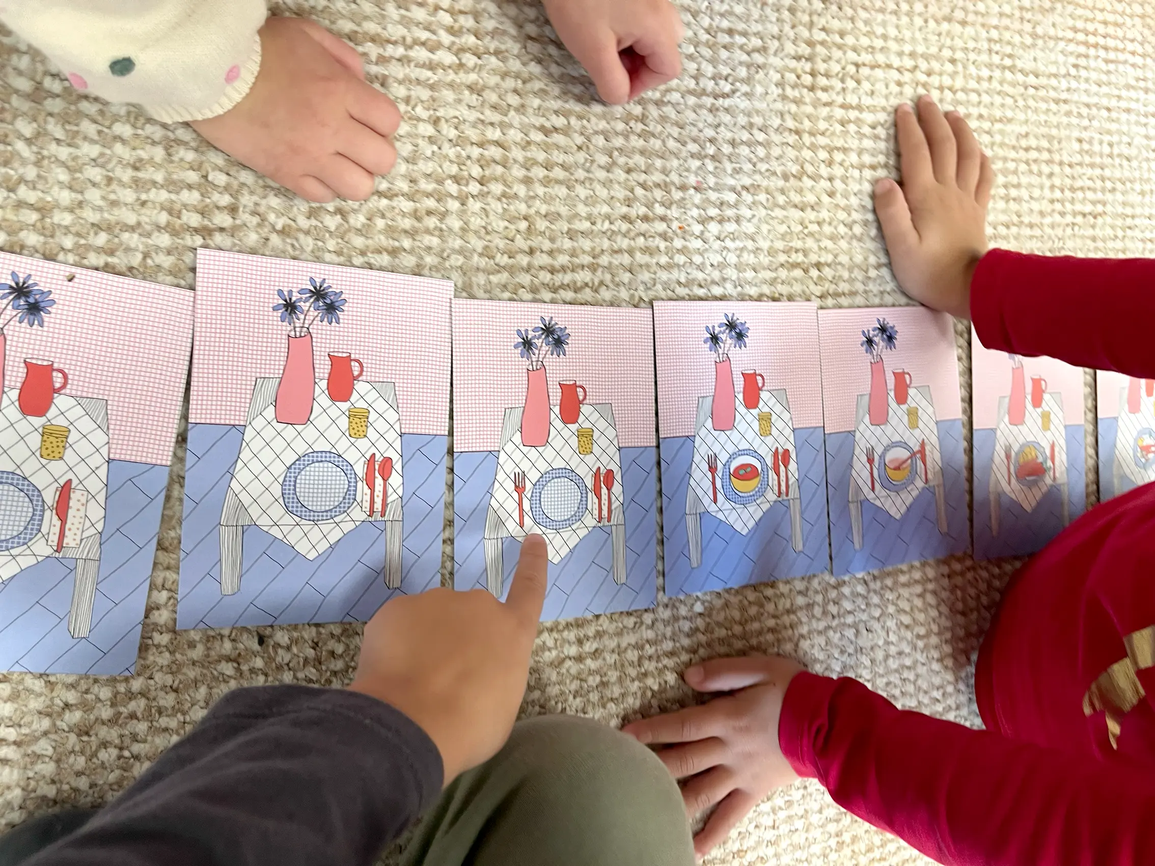 Pomůcka navazuje na četbu knihy Nedělní oběd. S dětmi si vyprávíme o stolování ve školce i u nich doma či o svátečním prostírání. Úkolem dětí je složit karty ve správné posloupnosti. Po sestavení karet si prohlédneme poslední karty a připomeneme si, kde správně leží příbory a jak je používáme. Dále můžeme otočit posledních pět karet a požádáme děti, aby si vzpomněly, jaká jídla jsou na obrázcích. Děti si podle karet mohou prostírání vyzkoušet.