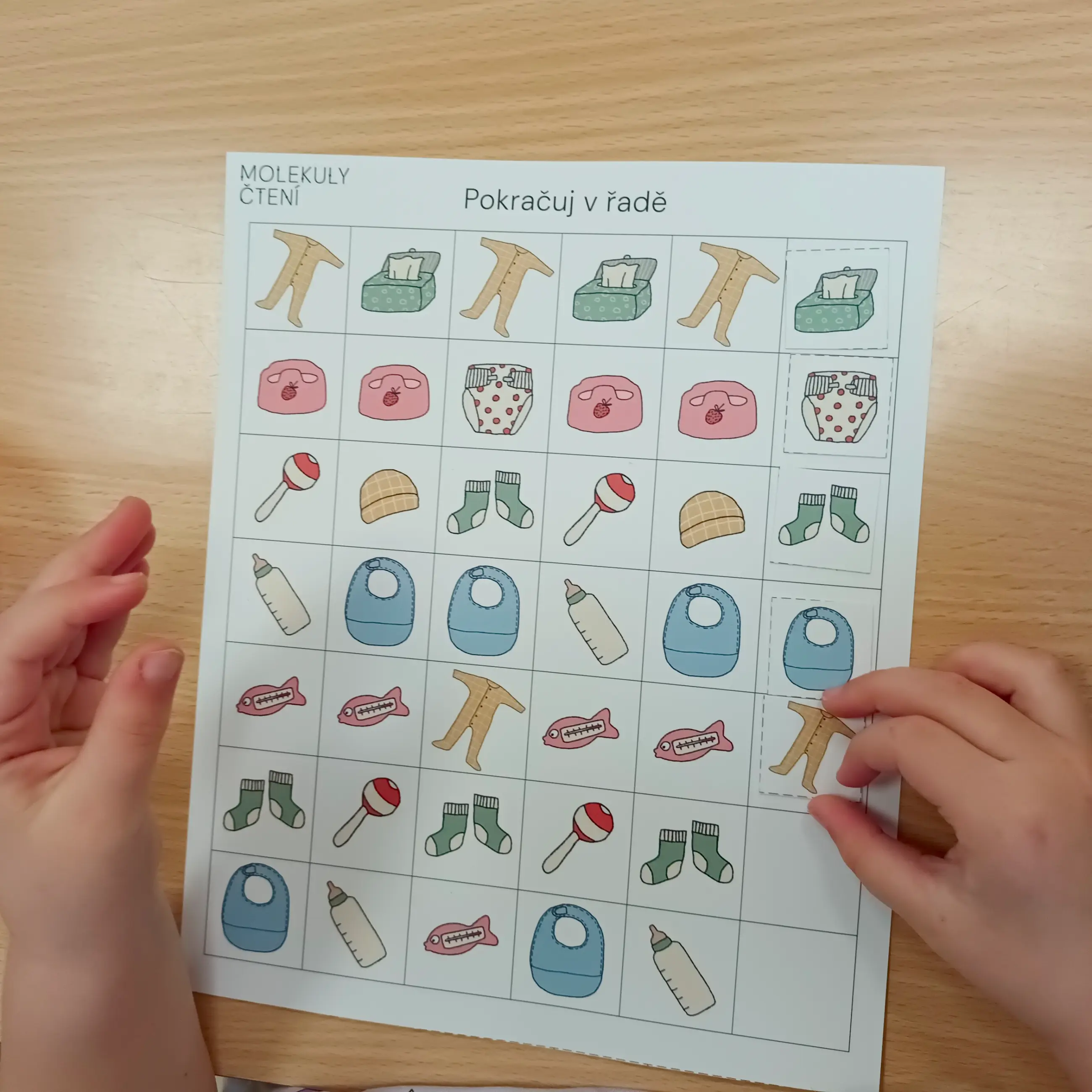 Prohlédneme si a pojmenujeme všechny obrázky na listu. Zeptáme se dětí, pro koho jsou asi věci určené a jestli by zvládly krátce popsat jejich využití. Jmenujeme věci a na konci řádku se zeptáme dětí, zda neví, jaký obrázek by mohl následovat. Děti se snaží vzorec rozluštit a dokončit. Z vystříhaných obrázků pak vybereme ten, který se na konec řady hodí, a tak řadu dokončíme.
