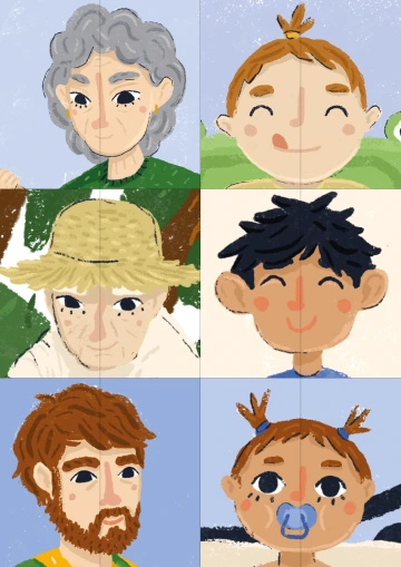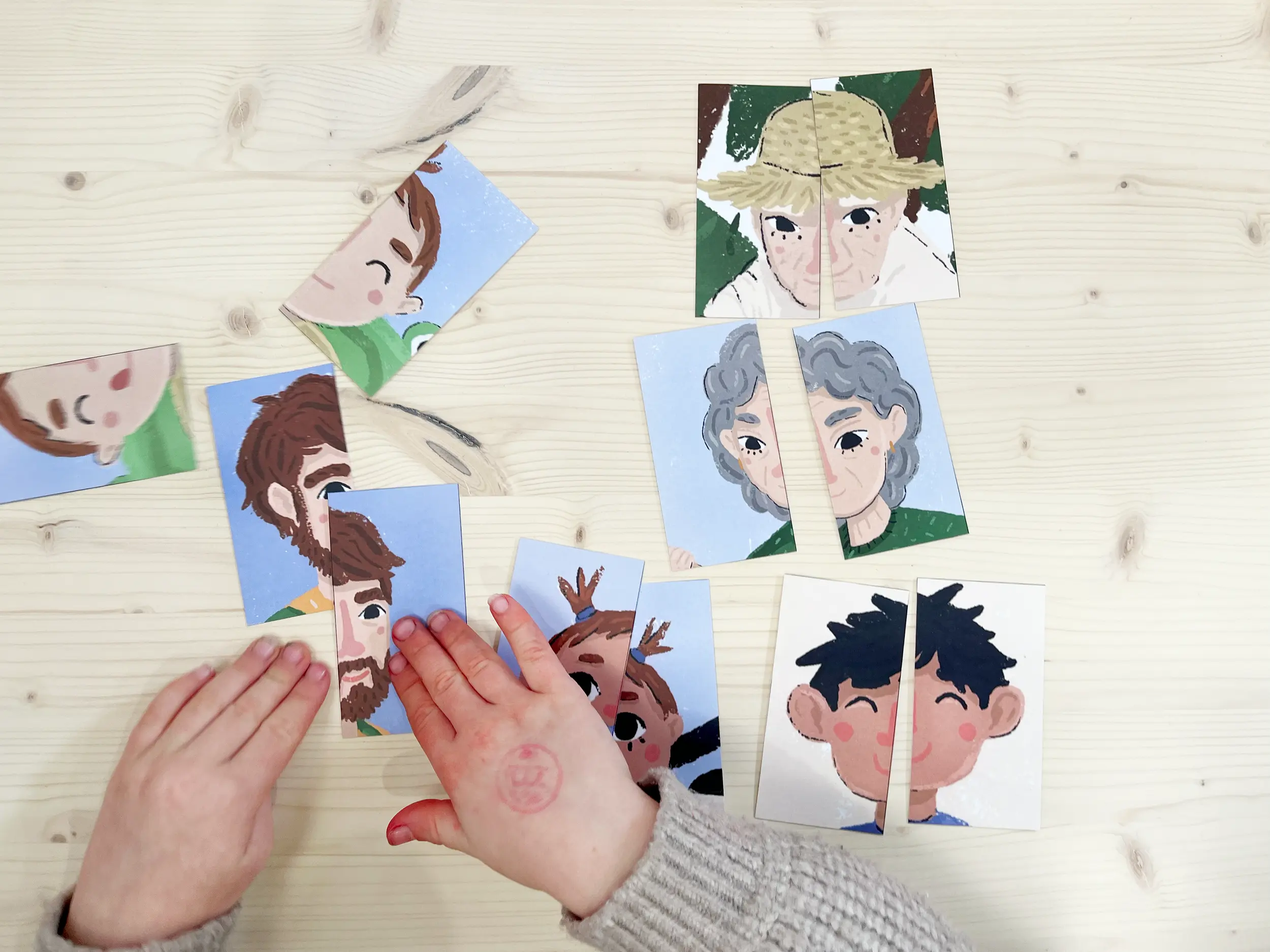 Práce s pomůckou navazuje na četbu knihy Moje rodina. Úkolem dětí je složit rozpůlené obrázky. Po sestavení portrétu si vzpomeneme, kdo je na obrázcích a jak se osoby jmenují. Dále můžeme s pomůckou pracovat obdobně jako s pomůckou STROM ŽIVOTA.