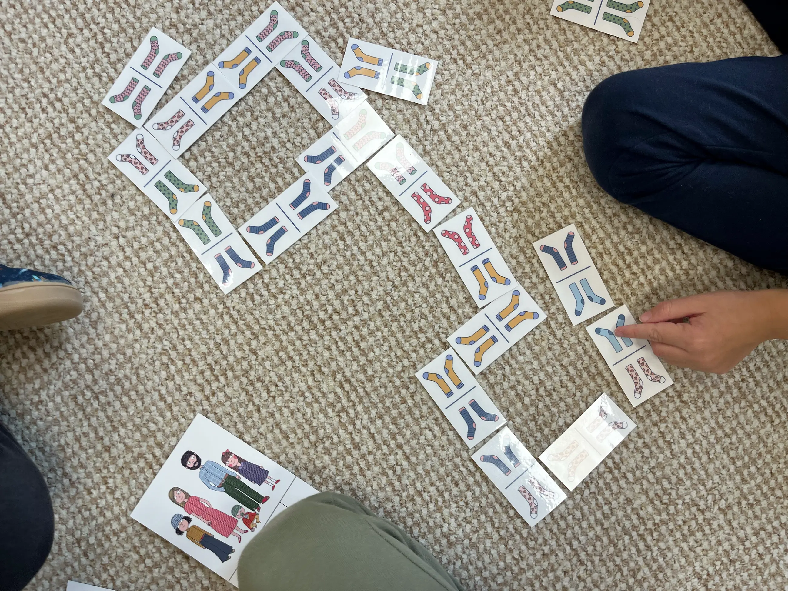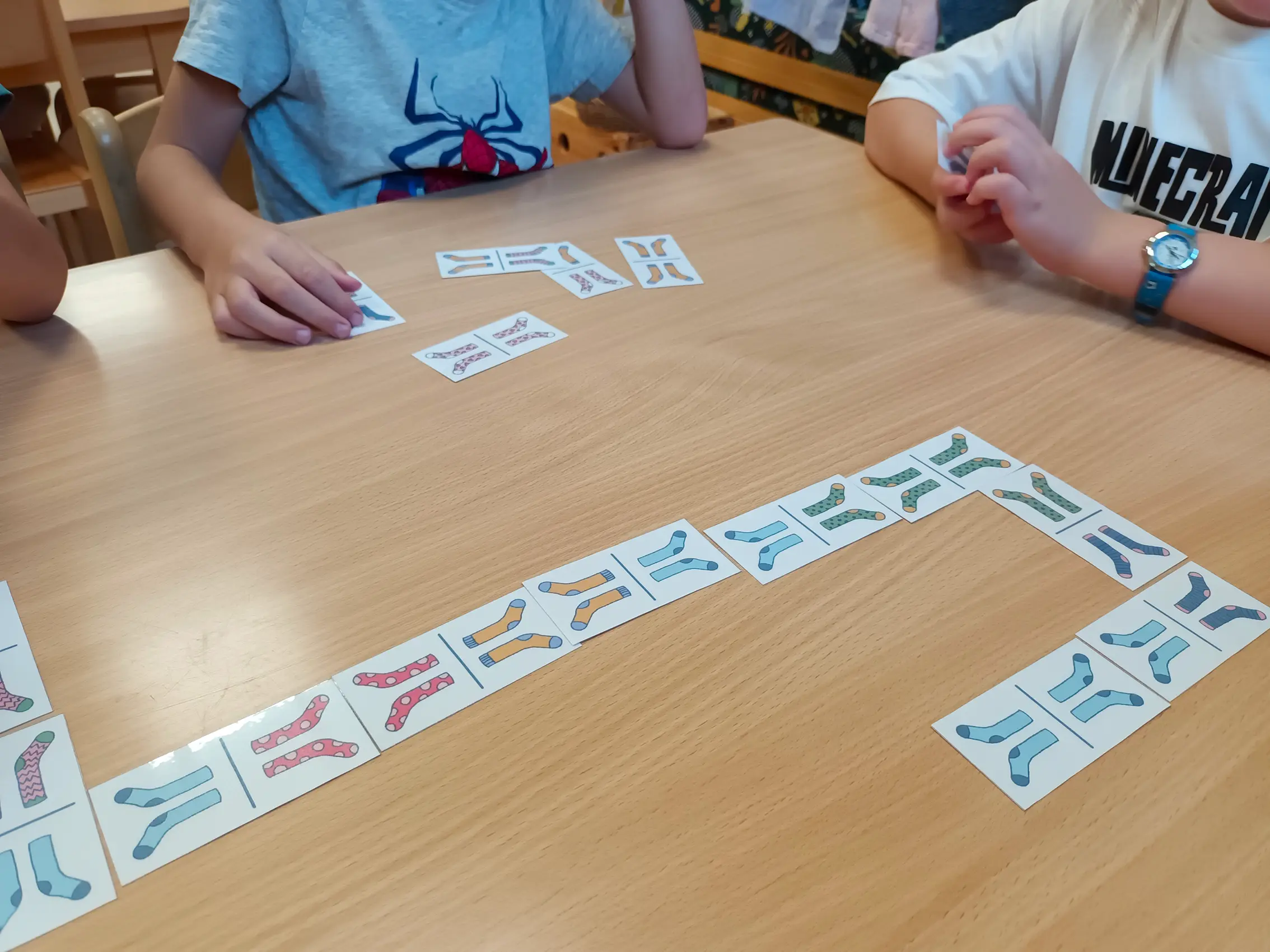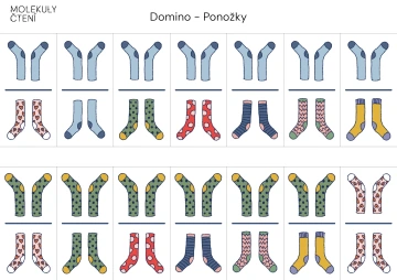 Kartičky si s dětmi prohlédneme a řekneme si, v čem se vyobrazené ponožky od sebe liší, jaké rozdíly sledujeme. Vysvětlíme si jednoduchá pravidla hry domino a dětem názorně ukážeme, jak k sobě kartičky řadíme a jak tvoříme dvojice. Zmíníme, že výsledný tvar cestičky, kterou kartičky budou tvořit, může být pokaždé jiný.