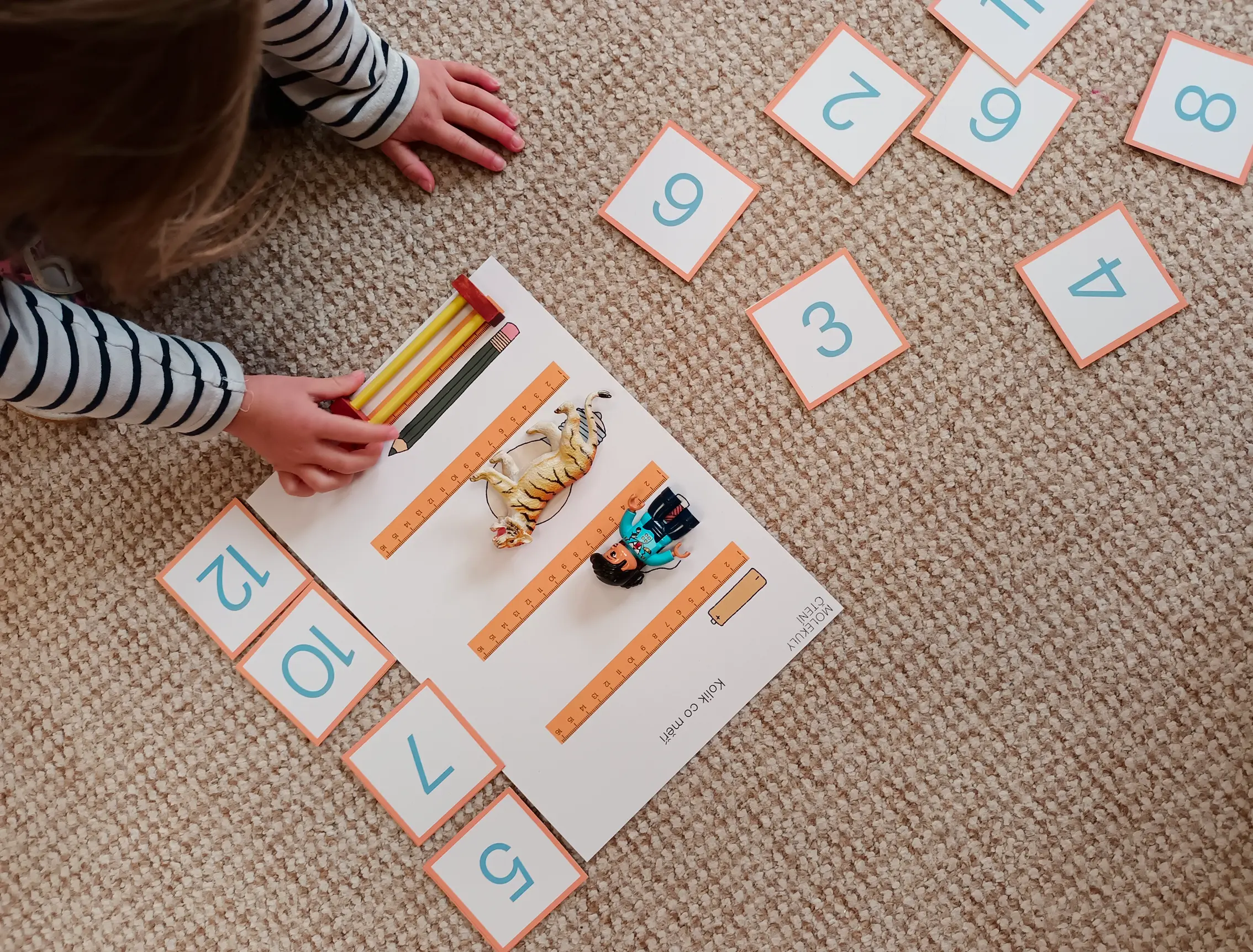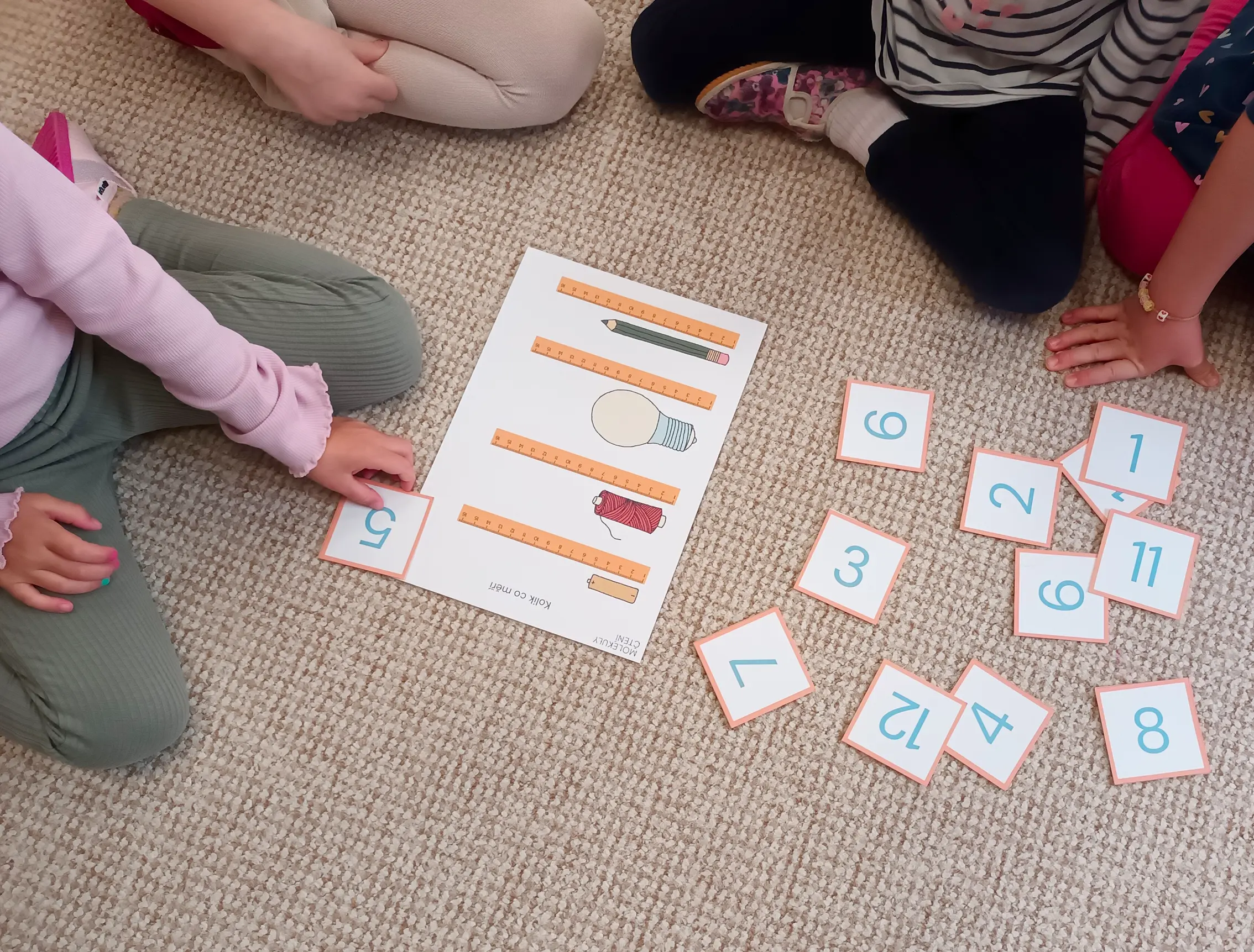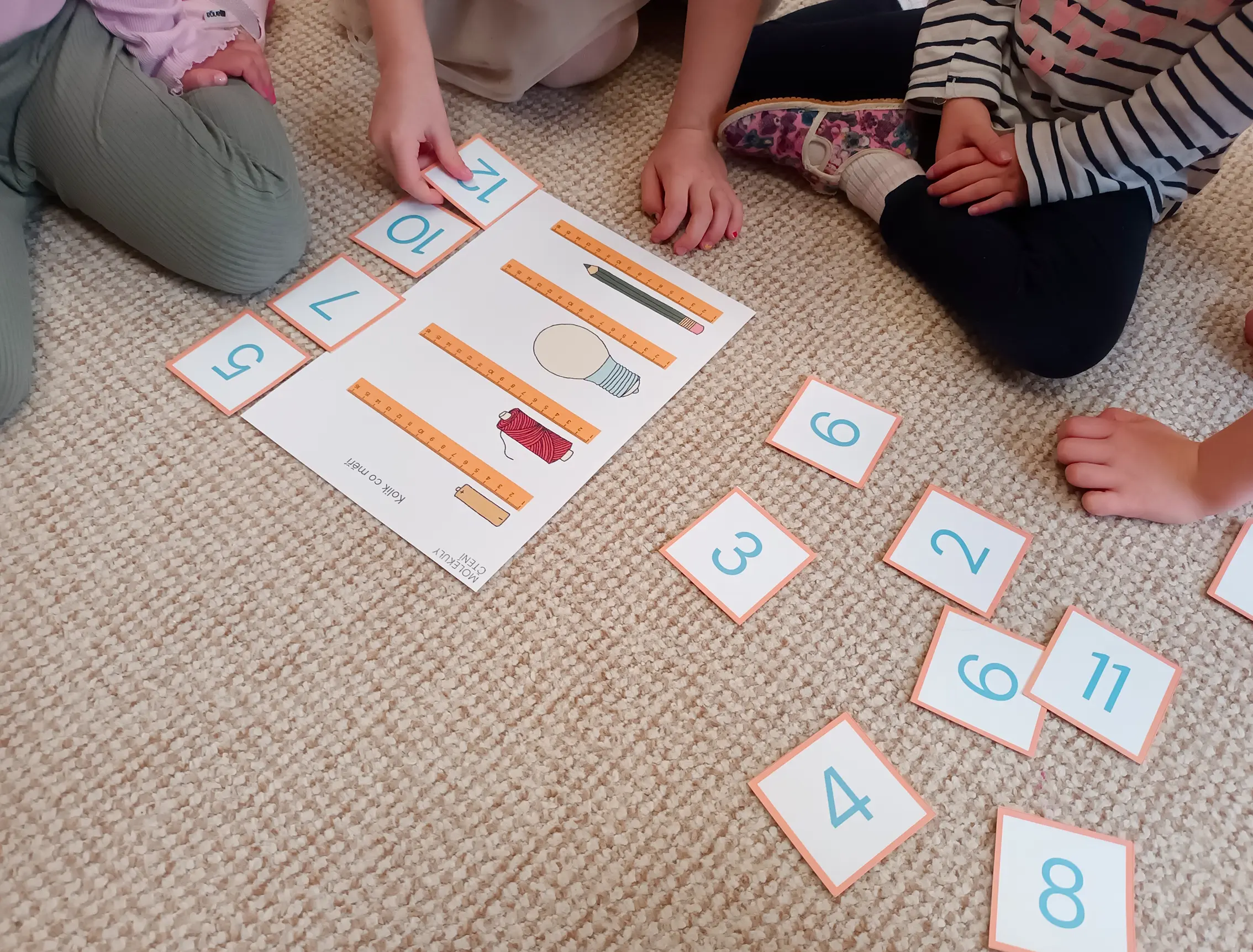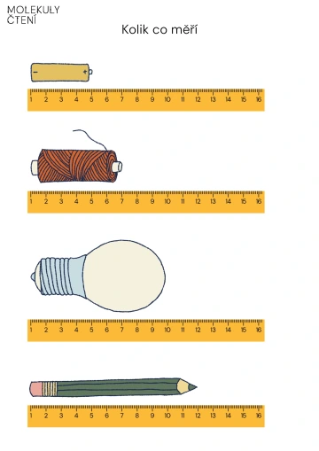 Práce s pomůckou volně navazuje na četbu knížky Nářadí a činnosti, při kterých se děti seznámily se skládacím metrem a měřením. Prohlédneme si a pojmenujme předměty na listu. Děti pak podle metru čtou, jak dlouhé jsou předměty a přikládají odpovídající číslici z ČÍSELNÝCH KARET. Dále můžeme děti požádat, aby se v prostoru třídy pokusily najít předměty o přibližně stejné délce a přiložily je k metru, aby si ověřily svůj odhad.