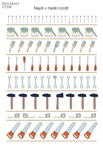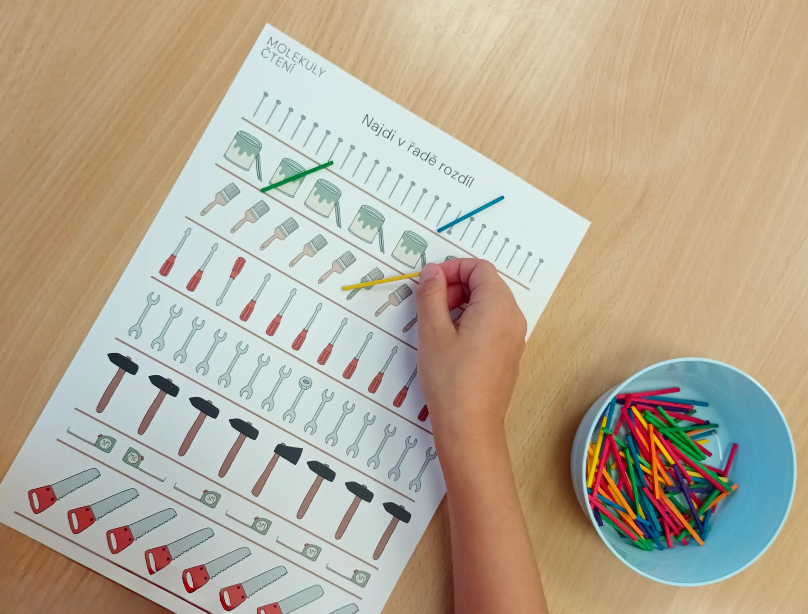 Prohlédneme si všechny předměty a vysvětlíme si jejich použití. Děti označují barevnými párátky předměty, které do řady nepatří, protože se liší v určitém detailu. Dále můžeme s jednotlivými řádky zkoušet odhad množství. Podíváme se na určitý řádek a ptáme se, jestli je v řádku více/méně předmětů než prstů na našich rukou/ruce. Společně pak předměty spočítáme a ověříme náš odhad.