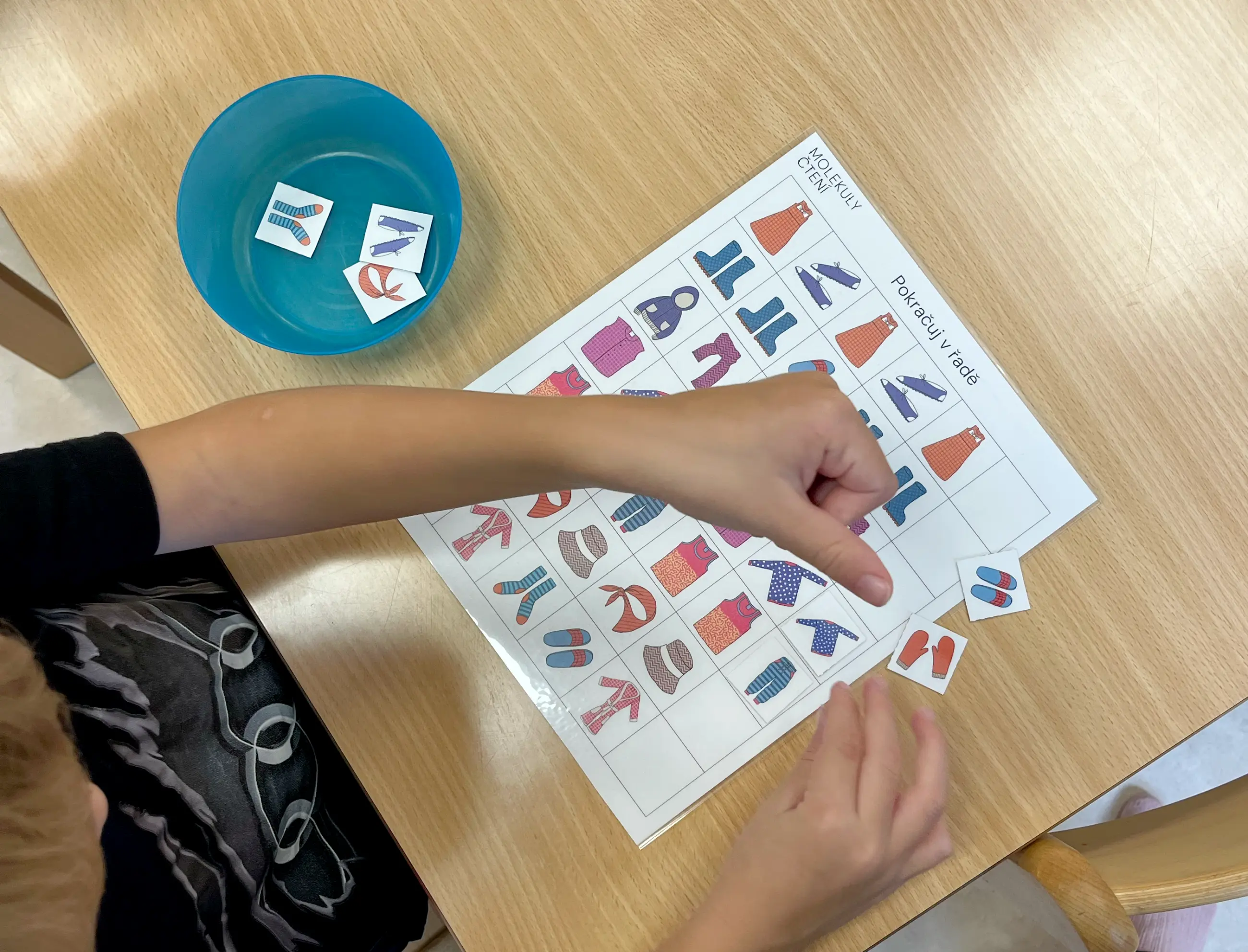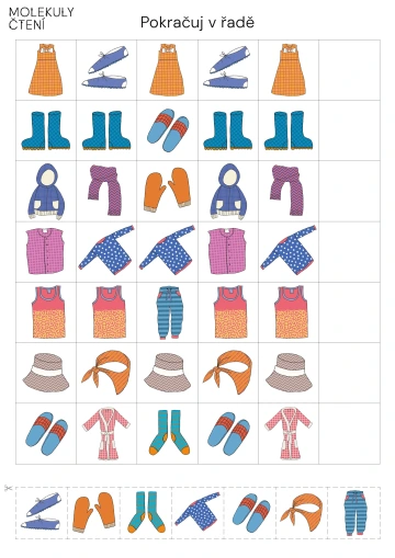 Prohlédneme si a pojmenujeme oblečení. Zeptáme se, které oblečení máme doma, které se nám líbí a kdy se co nosí. Jmenujeme oděvy a na konci řádku se zeptáme dětí, zda neví, jaký obrázek by mohl následovat. Děti se snaží vzorec rozluštit a dokončit. Z vystříhaných obrázků pak vybereme ten, který se na konec řady hodí, a řadu dokončíme.