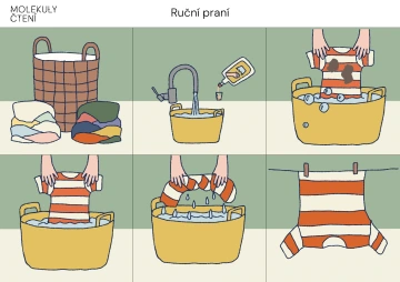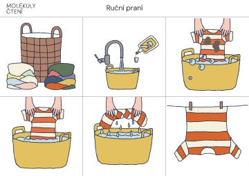 Činnost s touto pomůckou volně navazuje na knihu Velké prádlo. Prohlédneme si jednotlivé obrázky a popíšeme činnost, které je na nich zobrazená. Jednotlivé činnosti si prakticky ukážeme. Pokud máme karty rozstříhané, seřadíme je ve správné posloupnosti, umístíme na viditelné místo k prostoru, kde si děti mohou přepírat malé kousky látek a oblečení na panenky. Povíme si, co by se stalo, kdybychom některý krok pracovního postupu vynechali. Připomeneme si bezpečností pravidla práce s vodou.