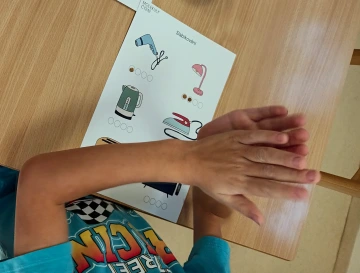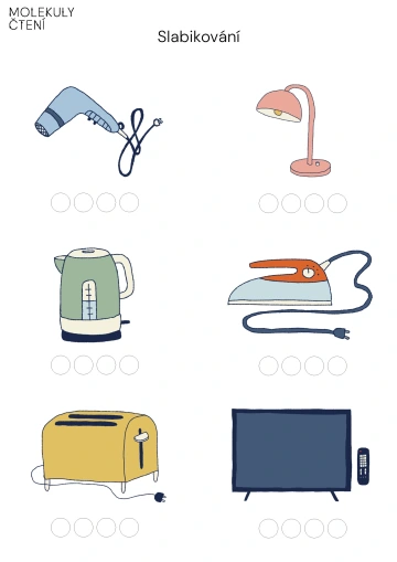 Pojmenujeme všechny spotřebiče a vysvětlíme si jejich použití v domácnosti. Názvy spotřebičů vytleskáme. Děti pak dostanou misku s čočkou, malými knoflíčky apod. a samostatně vyplní tolik koleček, kolik slabik napočítaly. Hledáme nejkratší/nejdelší slovo, slova se stejným počtem slabik. Kartičky mohou sloužit i k určování první hlásky ve slově.