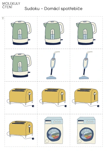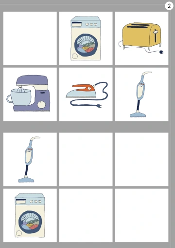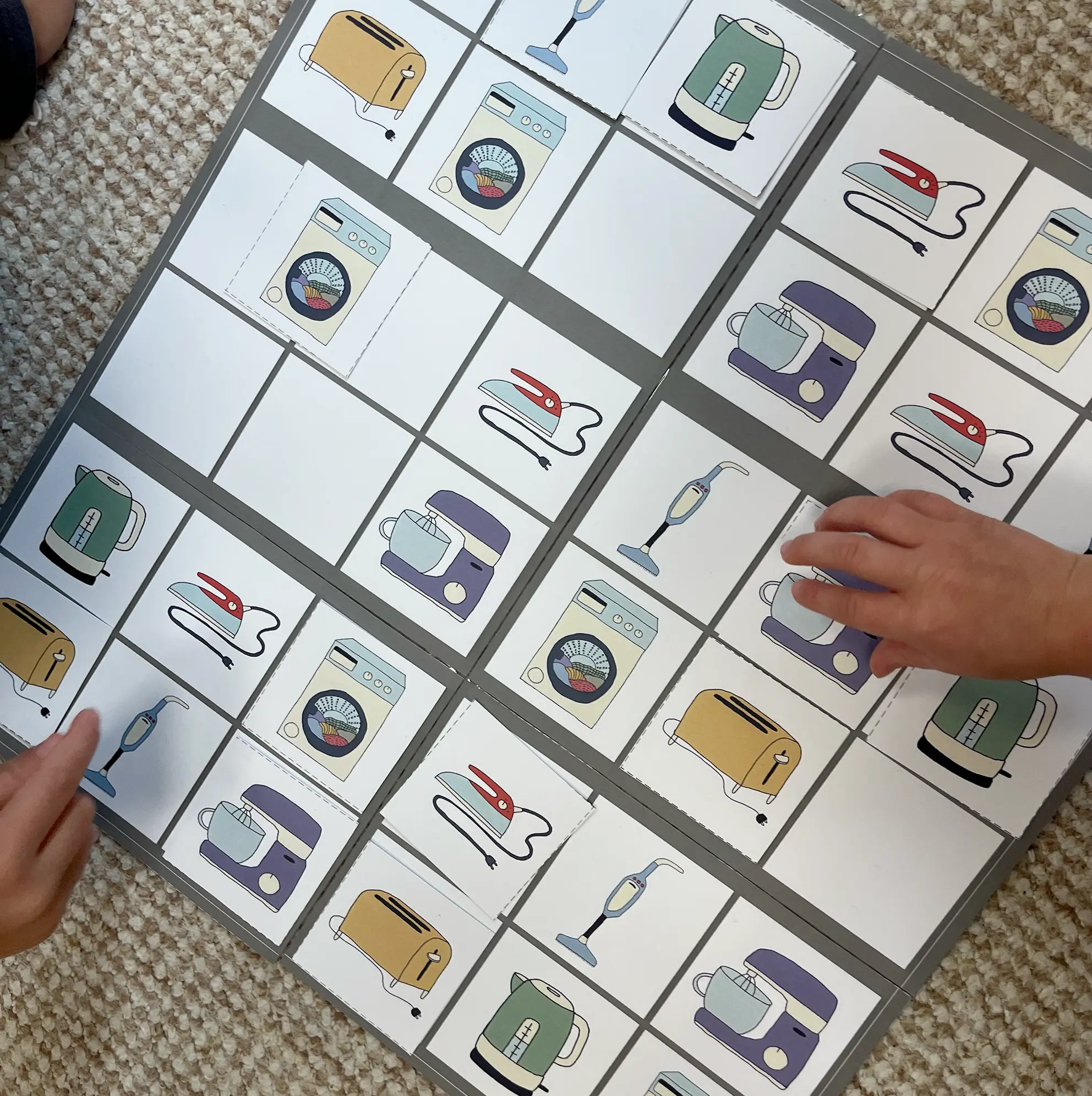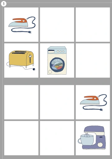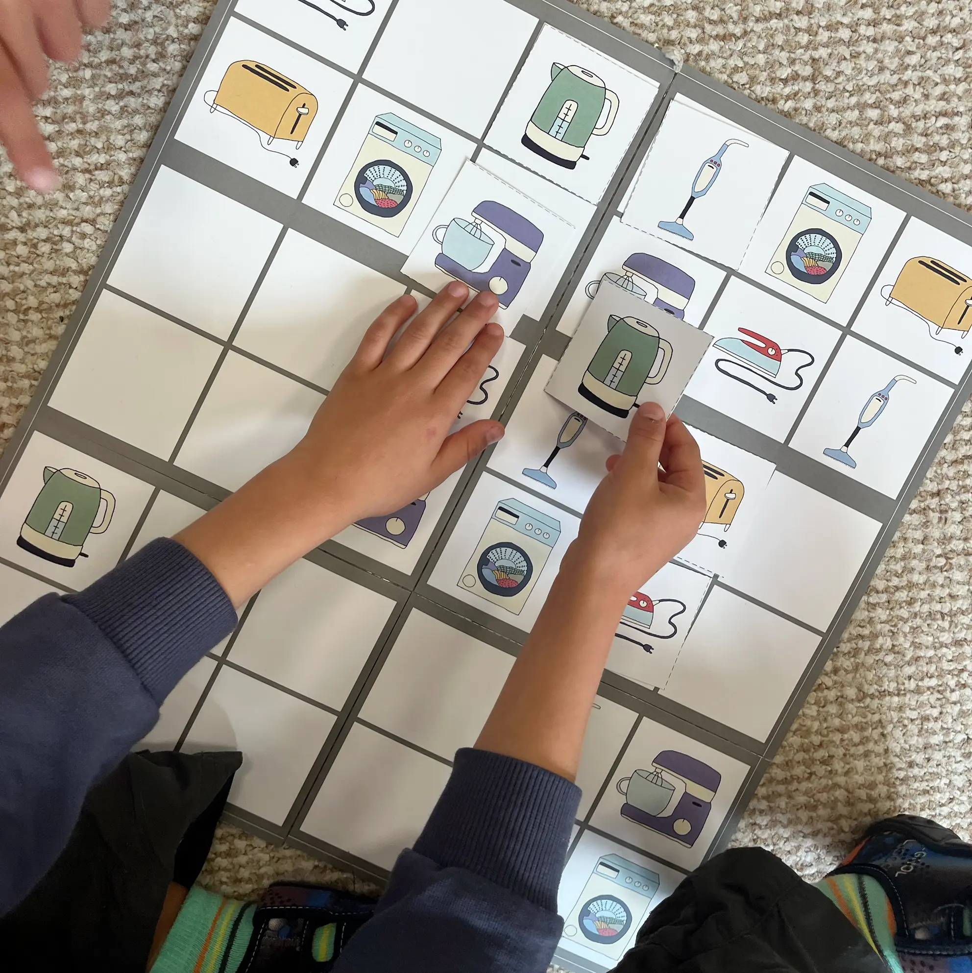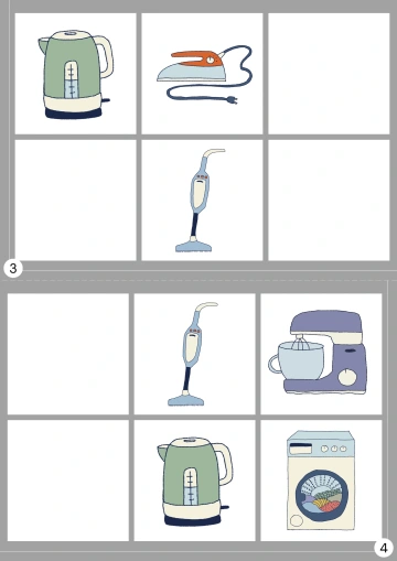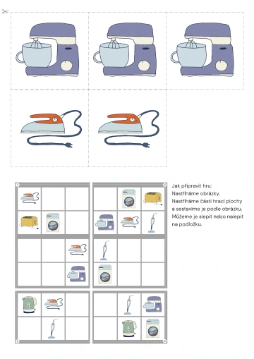 Společně si prohlédneme obrázky spotřebičů. Pojmenujeme je a zeptáme se, jak se nazývá činnost, při které daný spotřebič používáme (žehlení, mixování, vysávání atd.) nebo v jaké místnosti se daný spotřebič vyskytuje. Vysvětlíme a názorně dětem ukážeme, jak s kartičkami na hrací ploše pracujeme. Ukážeme si, jak se na hrací ploše orientovat. Co je sloupec, co je řádek? Zmíníme také, čeho si v sloupcích a řádcích všímat, abychom neopakovali stejný obrázek. Vysvětlíme si, že hra je vhodná pro jednoho hráče a že cílem je zaplnit celou hrací plochu tak, aby žádné okénko v mřížce nezůstalo prázdné.