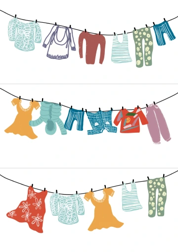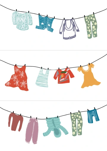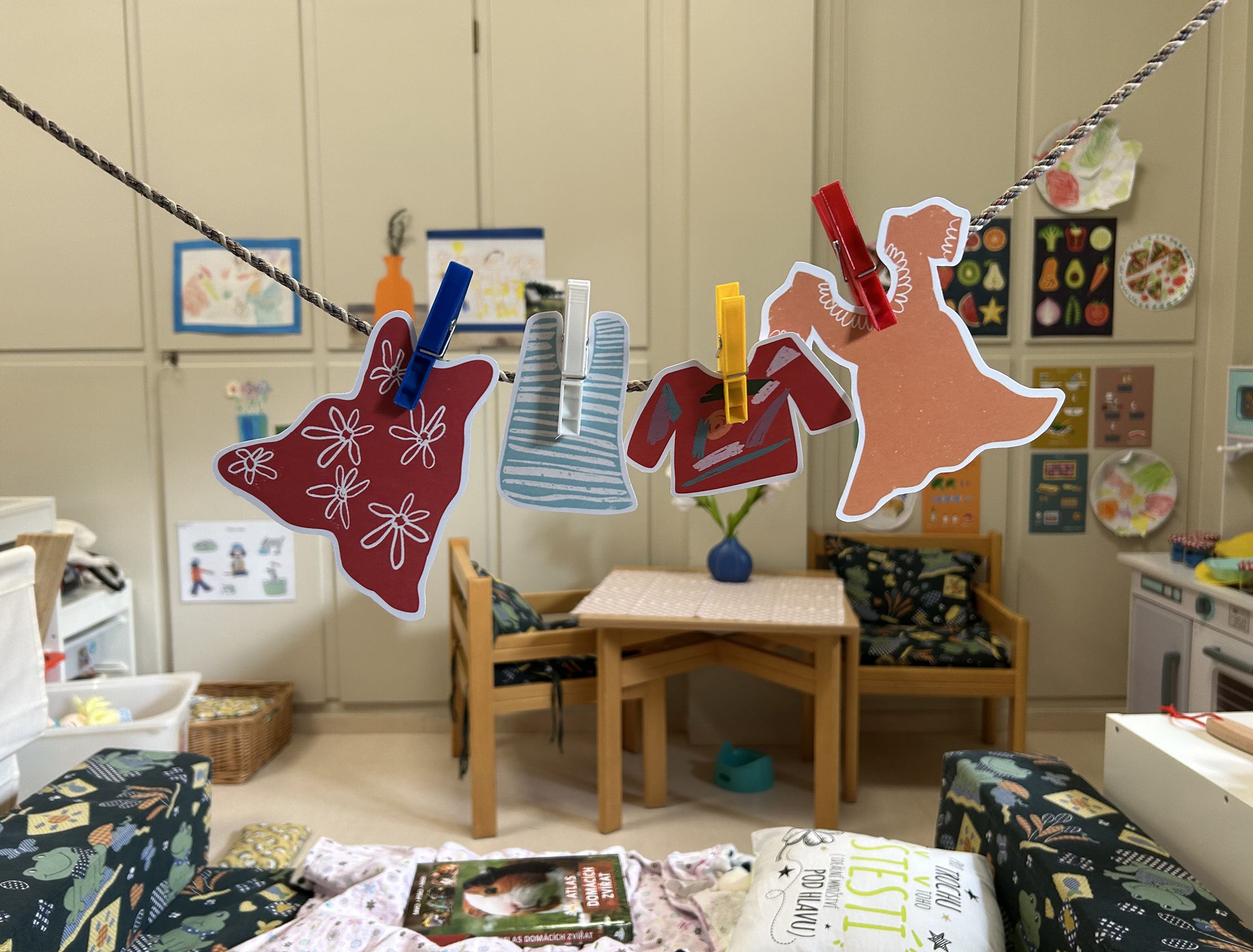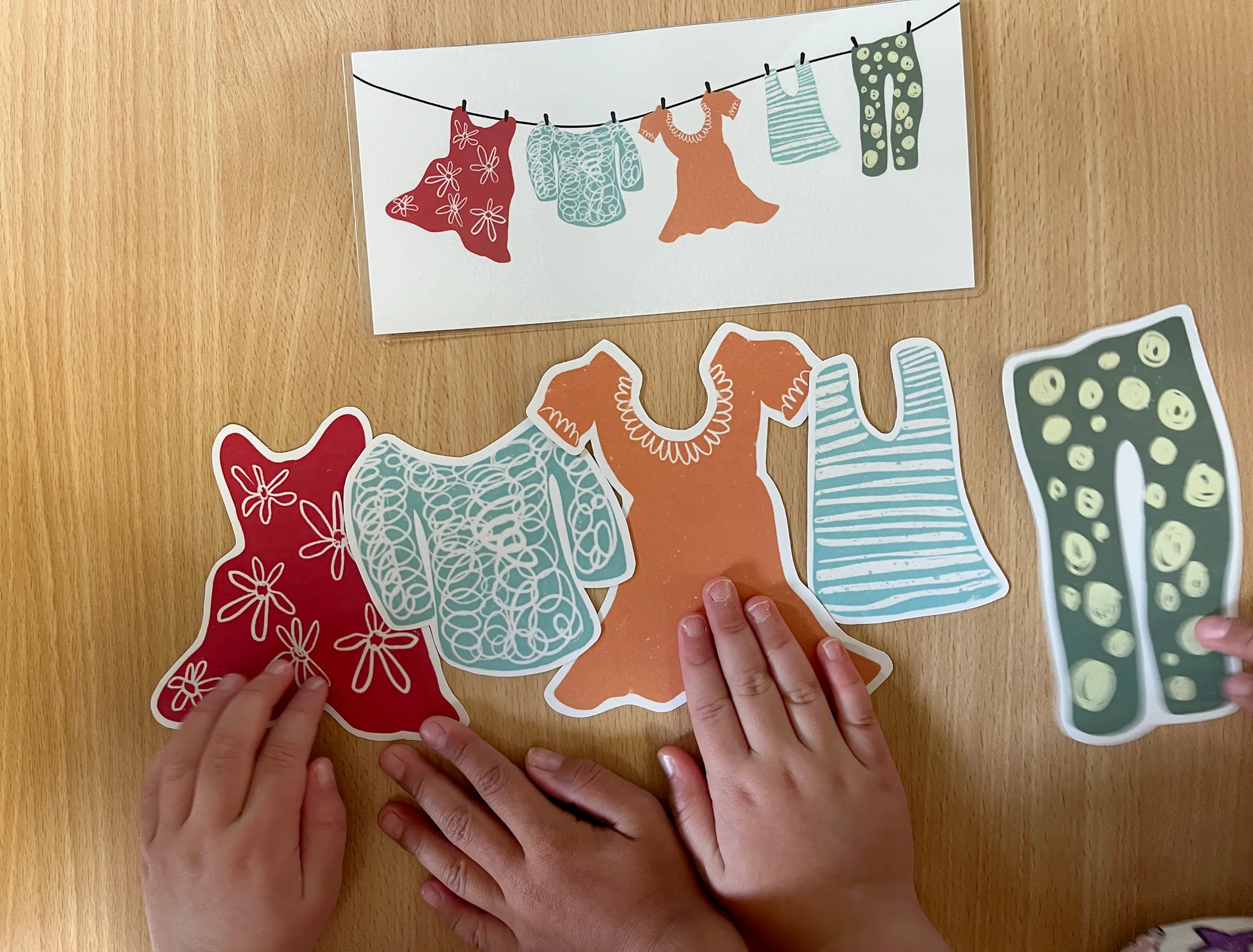 Pomůcka obrazově navazuje na knihu Velké prádlo. Ve třídě si pověsíme prádelní šnůru a ukážeme si, jak se používají kolíčky k zavěšení prádla na šňůru. Naším „prádlem“ jsou pro tuto činnost barevné obrázky oblečení. Děti věší oblečení na šnůru podle kartiček, které si umístí tak, aby na ně dobře viděly. Činnost mohou děti provádět i ve dvojicích, kdy jedno dítě druhému popisuje prádlo a jeho pořadí a pak společně zkontrolují správnost. Karty a oblečení se dají použít i při práci u stolu. Po dokončení práce se zeptáme: Vedle čeho visí tričko? Jaké oblečení je mezi...? apod.