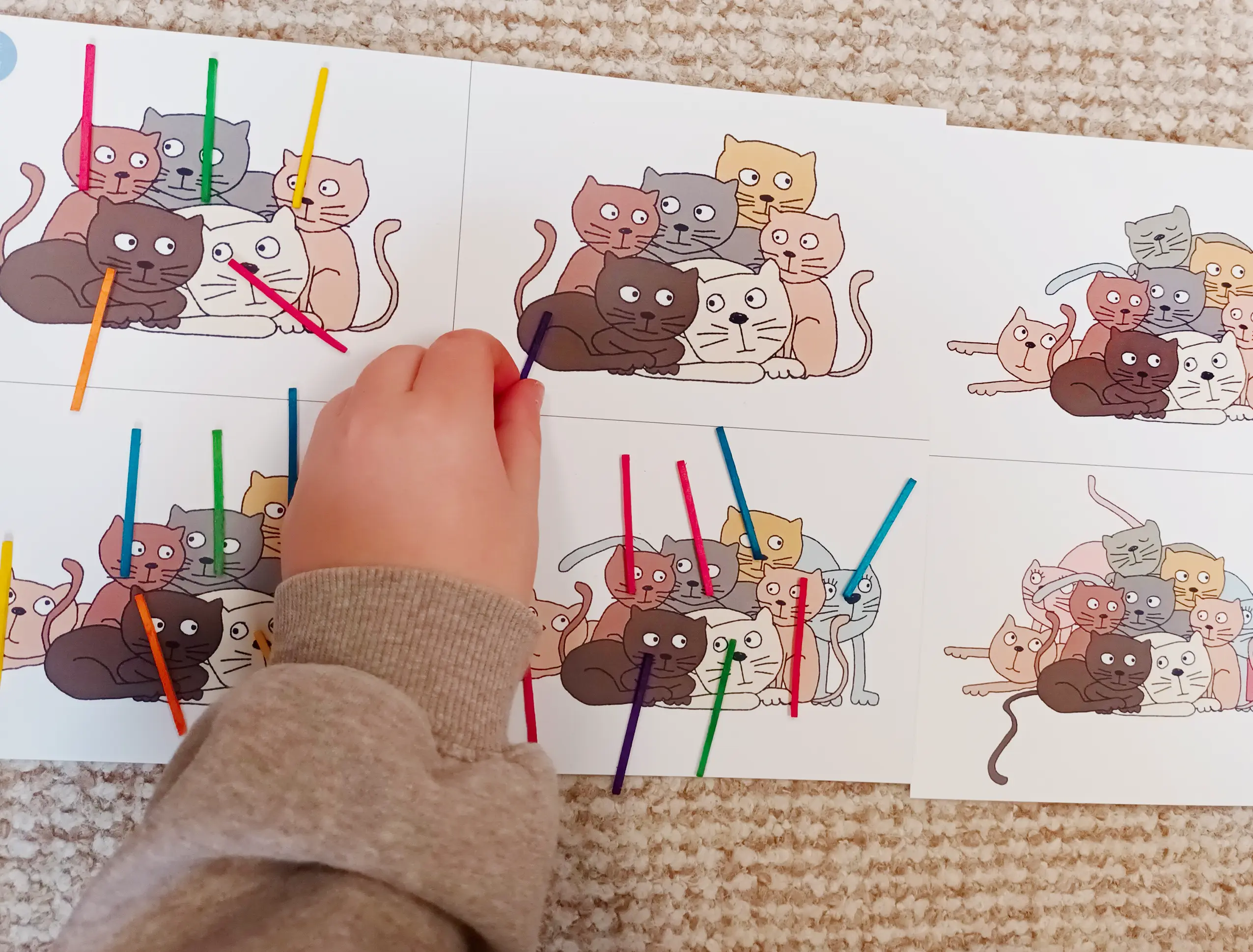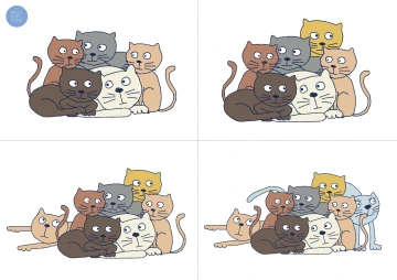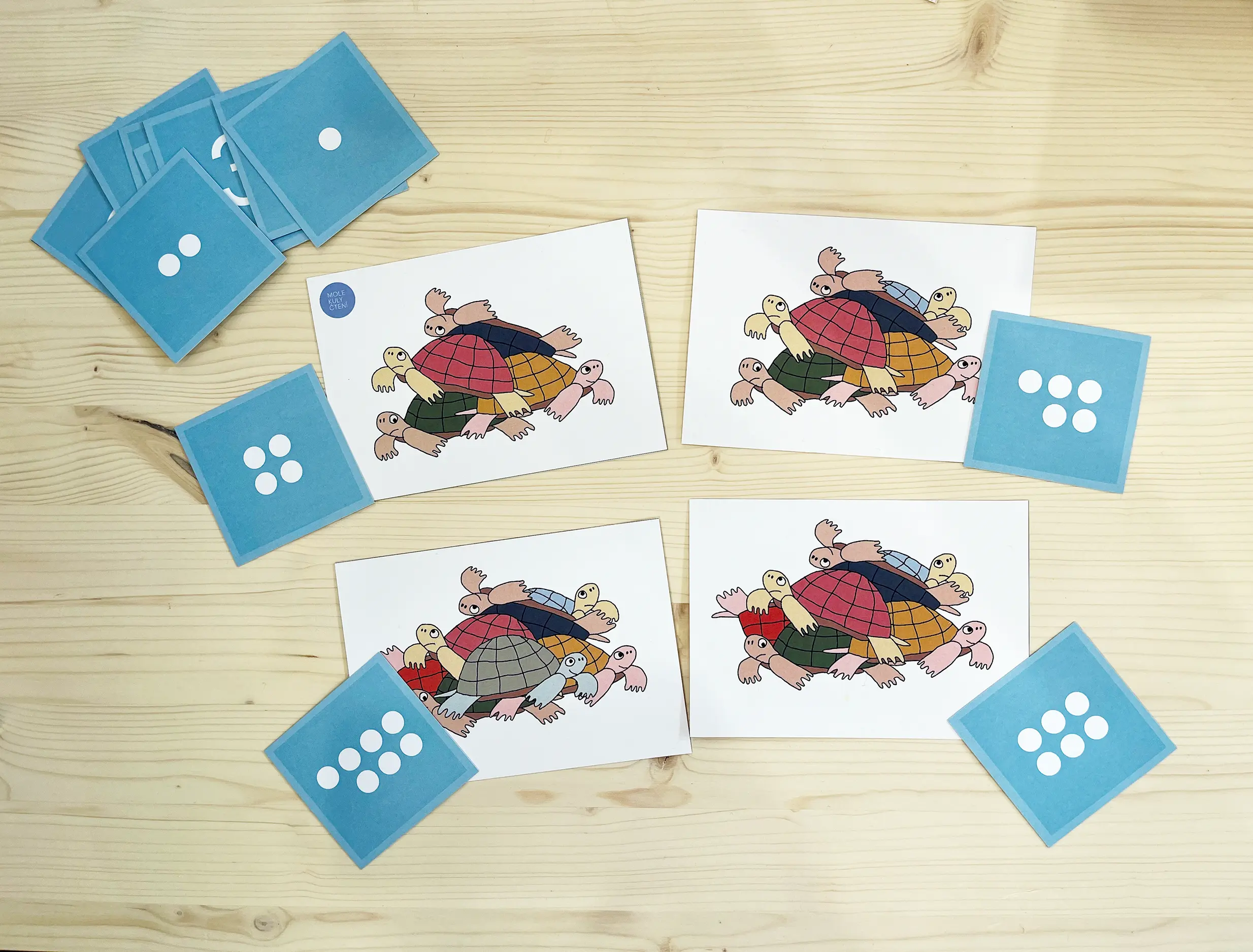 Nejprve si kartičky společně prohlédneme a pojmenujeme, jaká zvířata na nich vidíme. Poté zvířata spočítáme. Někdy se musíme chvíli soustředit, abychom odhalili všechna zvířata, která se částečně překrývají. K lepší orientaci můžeme použít barevná párátka a k vyjádření počtu ČÍSELNÉ KARTY. Porovnáváme mezi kartičkami, kde je zvířat více a kde méně, a řadíme je podle počtu. Můžeme také odhadnout počet podle krátkého pohledu.