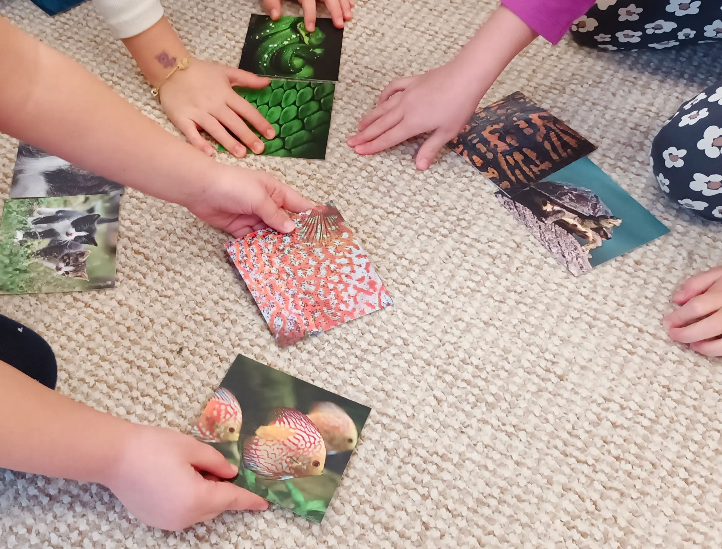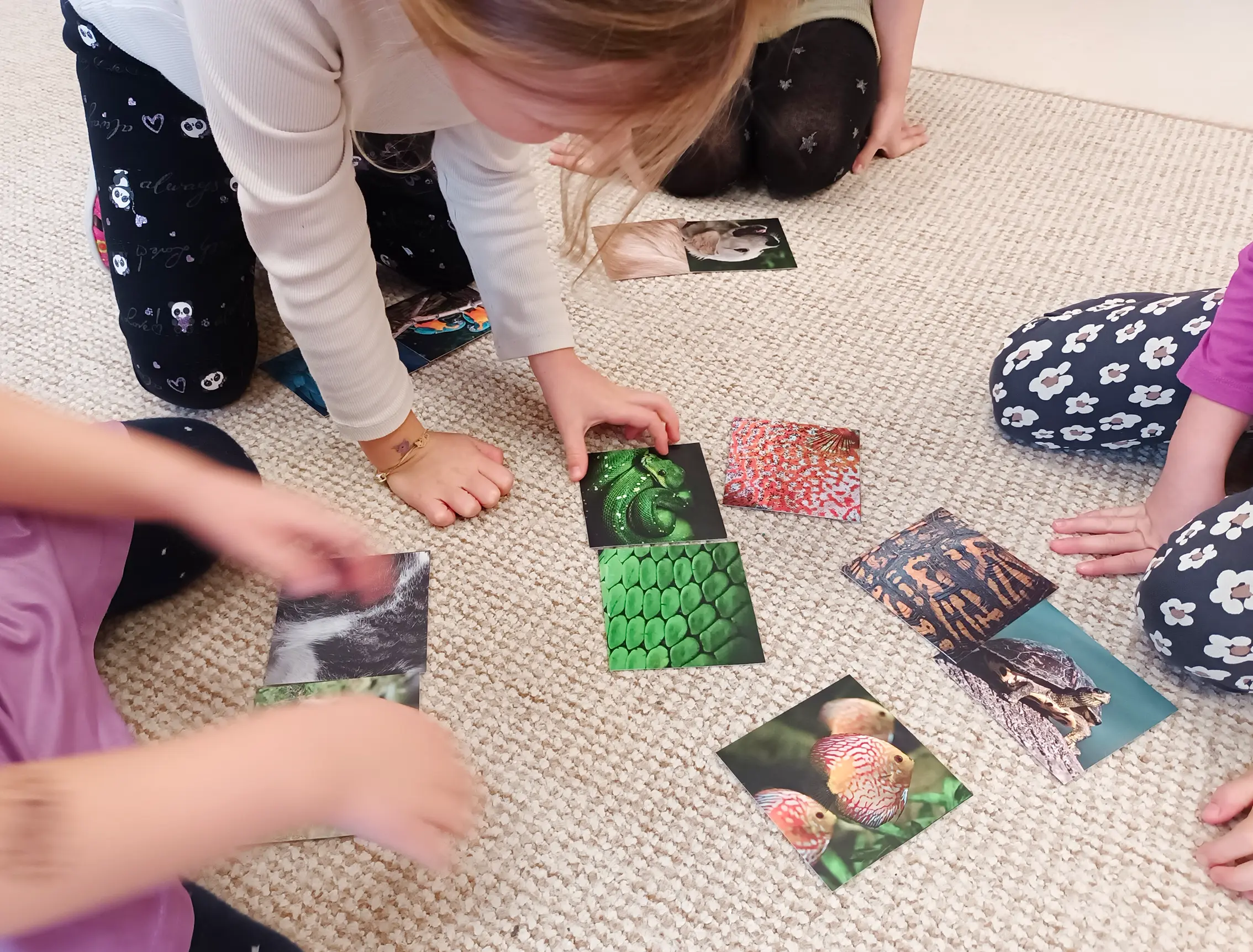 Dětem ukážeme kartičky se zvířaty a společně je pojmenujeme. Poté rozložíme kartičky s detaily „pod lupou“ a děti hledají, který detail patří ke kterému zvířeti. Povídáme si o tom, jak to poznaly – podle barvy, vzoru nebo struktury. Kartičky lze dále využít k jednoduchému třídění (např. domácí a volně žijící zvířata) nebo k hádání. Nejprve ukážeme pouze detail a děti tipují, ke kterému zvířeti patří.