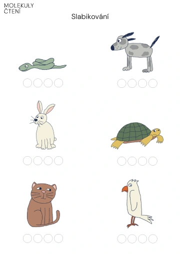 Pojmenujeme všechna zvířátka a zeptáme se dětí, jestli má někdo některé ze zvířátek doma jako domácího mazlíčka. Názvy zvířátek vytleskáme. Děti pak dostanou misku s čočkou, malými knoflíčky apod. a samostatně vyplní tolik koleček, kolik slabik napočítaly. Hledáme nejkratší/nejdelší slovo a slova se stejným počtem slabik. Obrázky mohou sloužit i k určování první hlásky ve slově a tvorbě zdrobnělin.