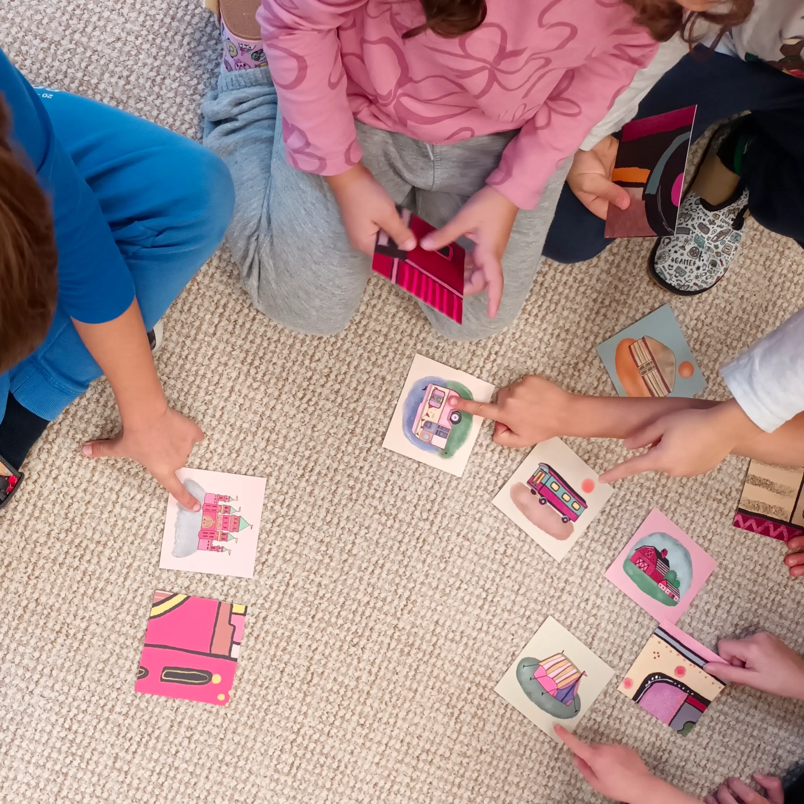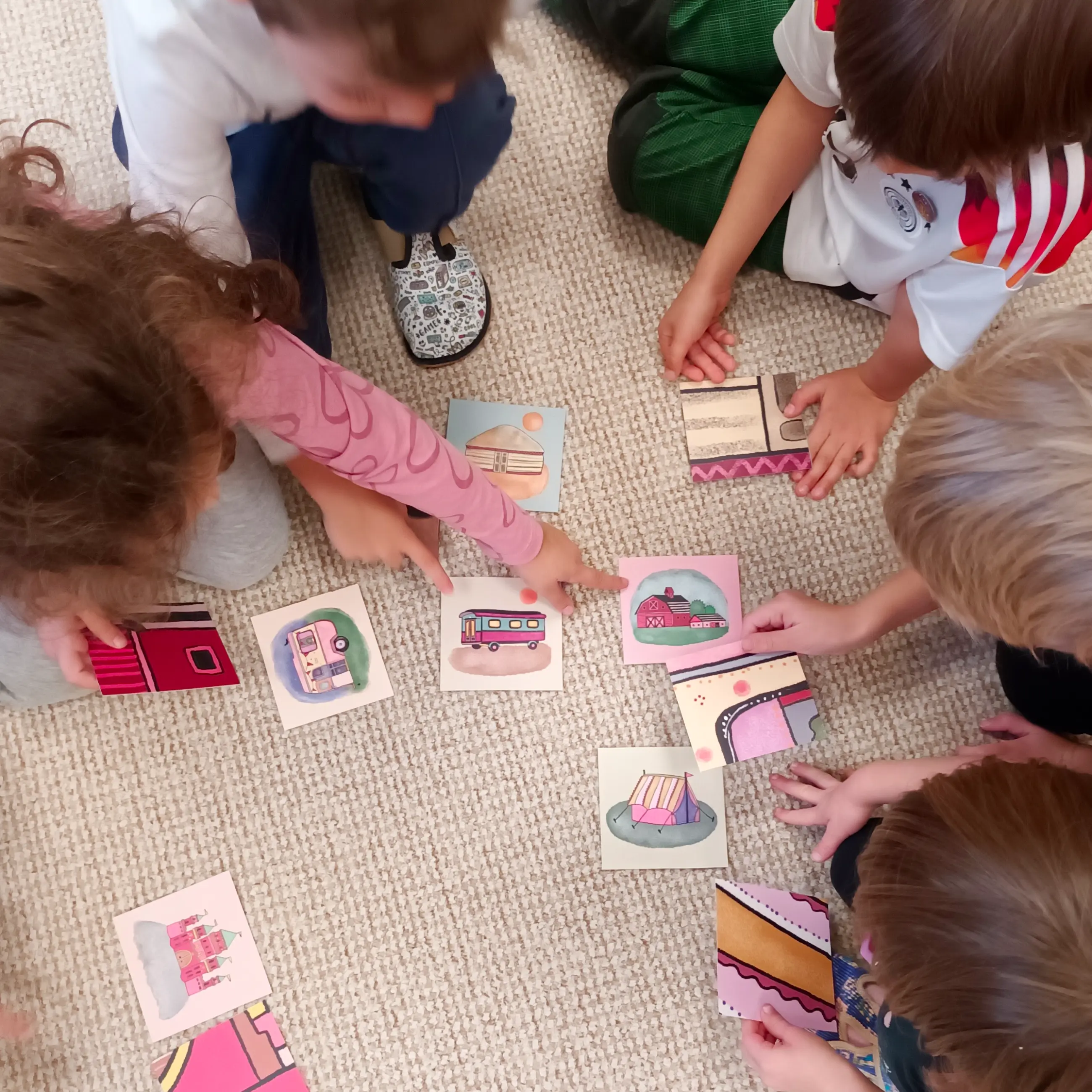 Práce s pomůckou navazuje na četbu knížky Kde bydlíme. Společně si prohlédneme všechny karty, které vyobrazují obydlí a pojmenujeme je. Poté hledáme, který detail patří ke kterému z obydlí, a karty k sobě přiřazujeme. Pomůcku můžeme využít i k rozhovorům o různých způsobech bydlení lidí po světě. Zeptáme se dětí, kde by ony chtěly bydlet a proč.