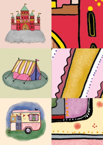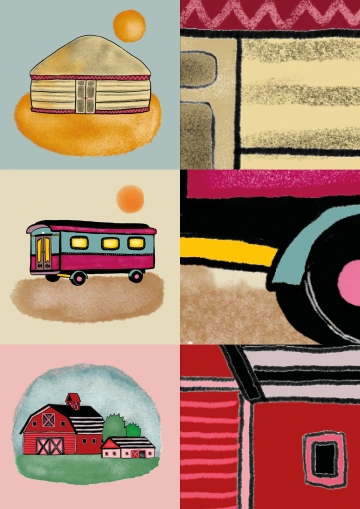 2 A4, které po rozstříhání tvoří dvanáct samostatných karet, na nichž jsou vyobrazeny různé typy obydlí a jejich detaily.