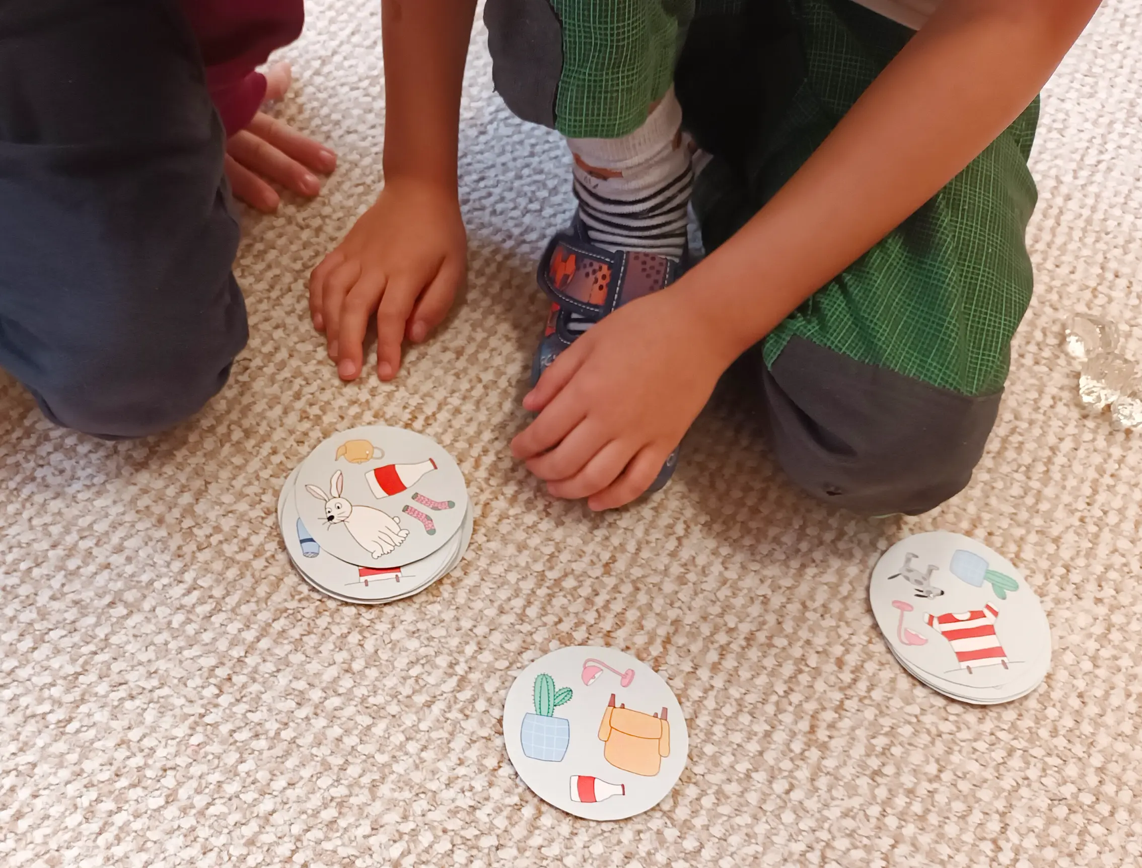 Kdo najde první – položíme dvě kartičky na stůl a děti hledají, který obrázek mají obě společný. Kdo ho první pojmenuje, získává bod či kartičku.