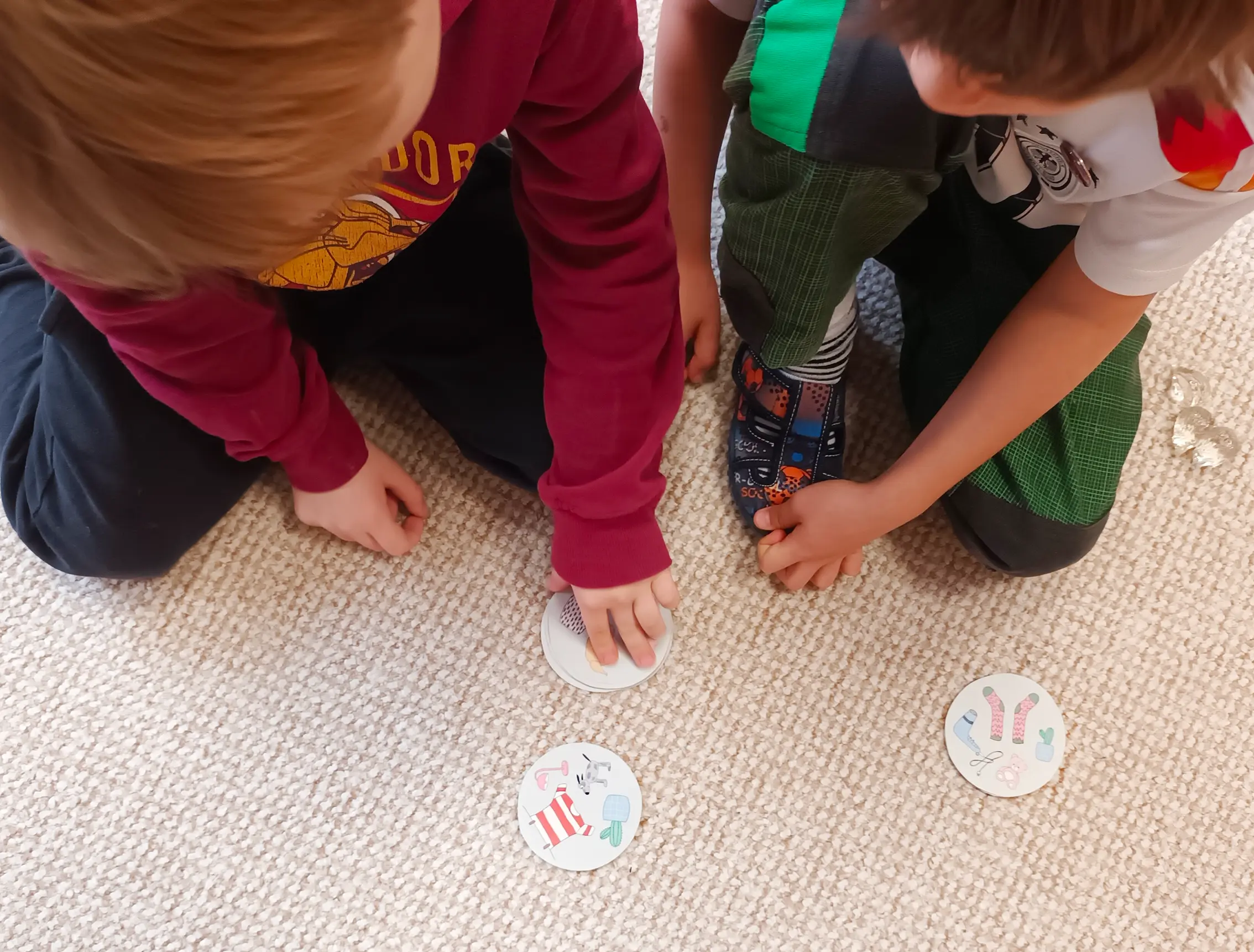 Rychlé párování – každé dítě má jednu kartičku, uprostřed stolu je hromádka dalších, ze které se otáčí vrchní. Děti hledají motiv shodný s jejich kartičkou.