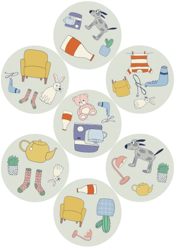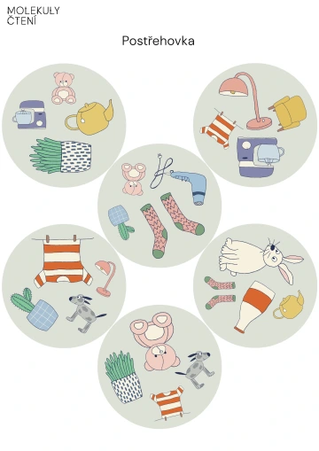 Pomůcka obsahuje dvě strany formátu A4, na kterých jsou vyobrazeny kruhové kartičky určené k vystříhání s obrázky předmětů z domácnosti.