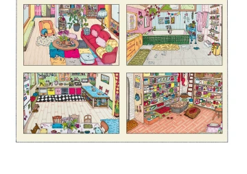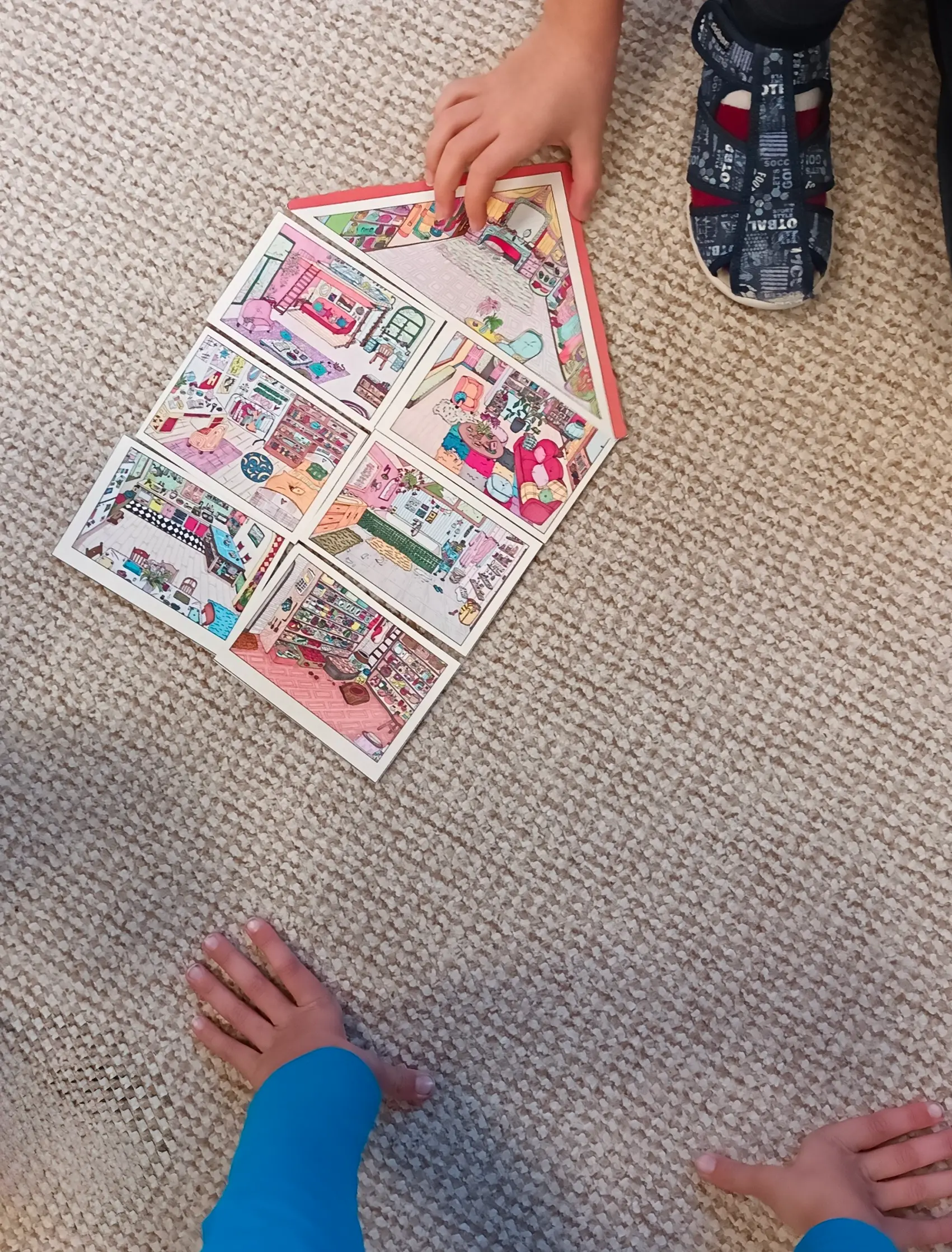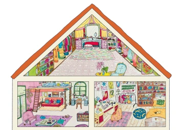 Práce s pomůckou volně navazuje na četbu knihy U nás doma. Úkolem dětí je sestavit dům rozstříhaný na puzzle. Protože pomůcka nemá předem dané čáry rozstřihu, náročnost puzzlů si určíme sami. Pokud se rozhodneme dům rozstříhat na jednotlivé místnosti, můžeme dětem dávat slovní úkoly typu: Přála bych si mít kuchyň vedle obývacího pokoje, Dětské pokoje v přízemí apod. Prohlídneme si sestavený dům a povídáme si v čem se podobá našemu bydlení a v čem se naopak liší. Co se nám líbí a ve které místnosti bychom chtěli trávit náš čas. Necháme děti sestavit si dům podle jejich přání. Pokud nám nějaká místnost chybí, můžeme ji dokreslit a přidat další patro.
