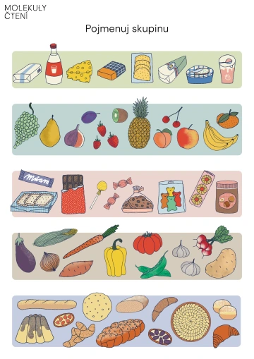 Prohlédneme si a pojmenujeme všechny potraviny v jedné skupině. Poté společně hledáme, co mají společného, a snažíme se určit název celé skupiny, tedy slovo nadřazené (např. ovoce, zelenina, mléčné výrobky, pečivo). Povzbuzujeme děti, aby svůj návrh zdůvodnily a popsaly, podle čeho skupinu rozpoznaly. Společně přemýšlíme, které další potraviny by mohly do stejné skupiny ještě patřit. Povídáme si, které potraviny máme nejraději a jaká skupina jídel by měla být nejčastěji zastoupena v našem jídelníčku. Pomůcku můžeme kombinovat s pomůckou Zdravý talíř, kde hledáme zastoupení jednotlivých skupin.