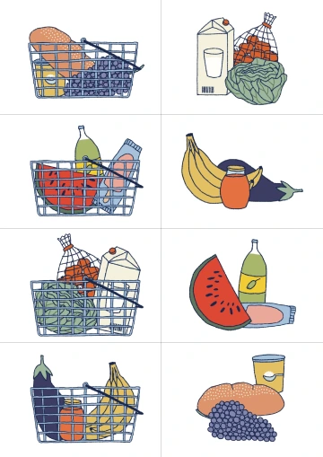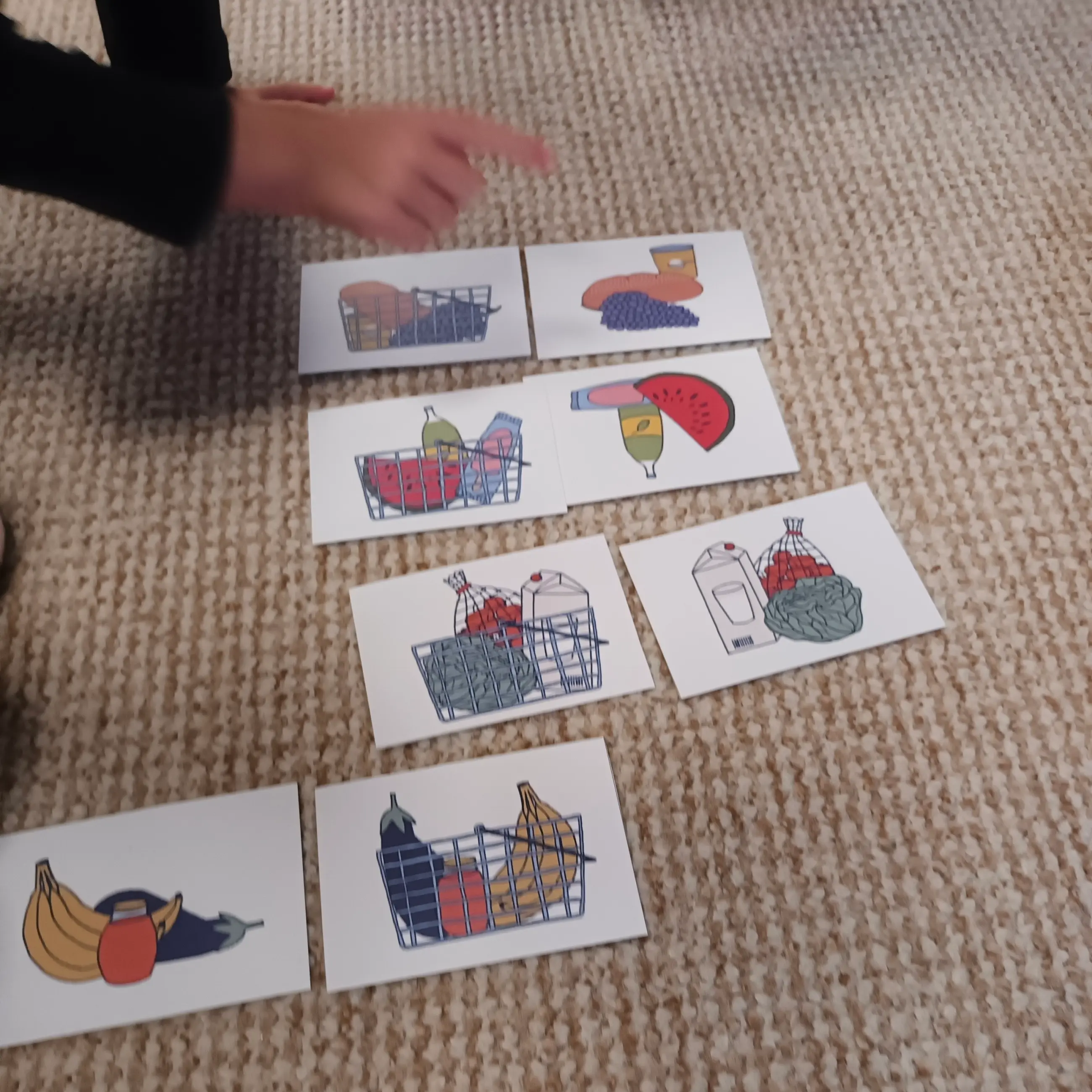 Rozstříháním listu získáme 4 dvojice kartiček. Kartičky rozdělíme na dvě hromádky, které rozprostřeme na zem před děti. Na jedné hromádce máme obrázky s nákupním košíkem, na druhé hromádce bez košíku. Vyzveme jedno z dětí, aby si vybralo jeden nákupní košík a pojmenovalo, jaké potraviny košík obsahuje. Poté jej vyzveme, aby mezi kartičkami na druhé hromádce našlo stejnou skupinu potravin. Hru je možné také otočit a začít s hromádkou bez nákupního košíku. Děti mohou spočítat, kolik věcí košík obsahuje.