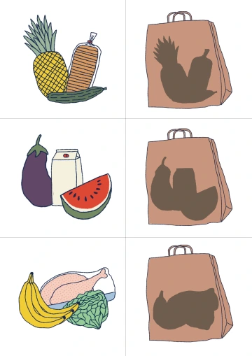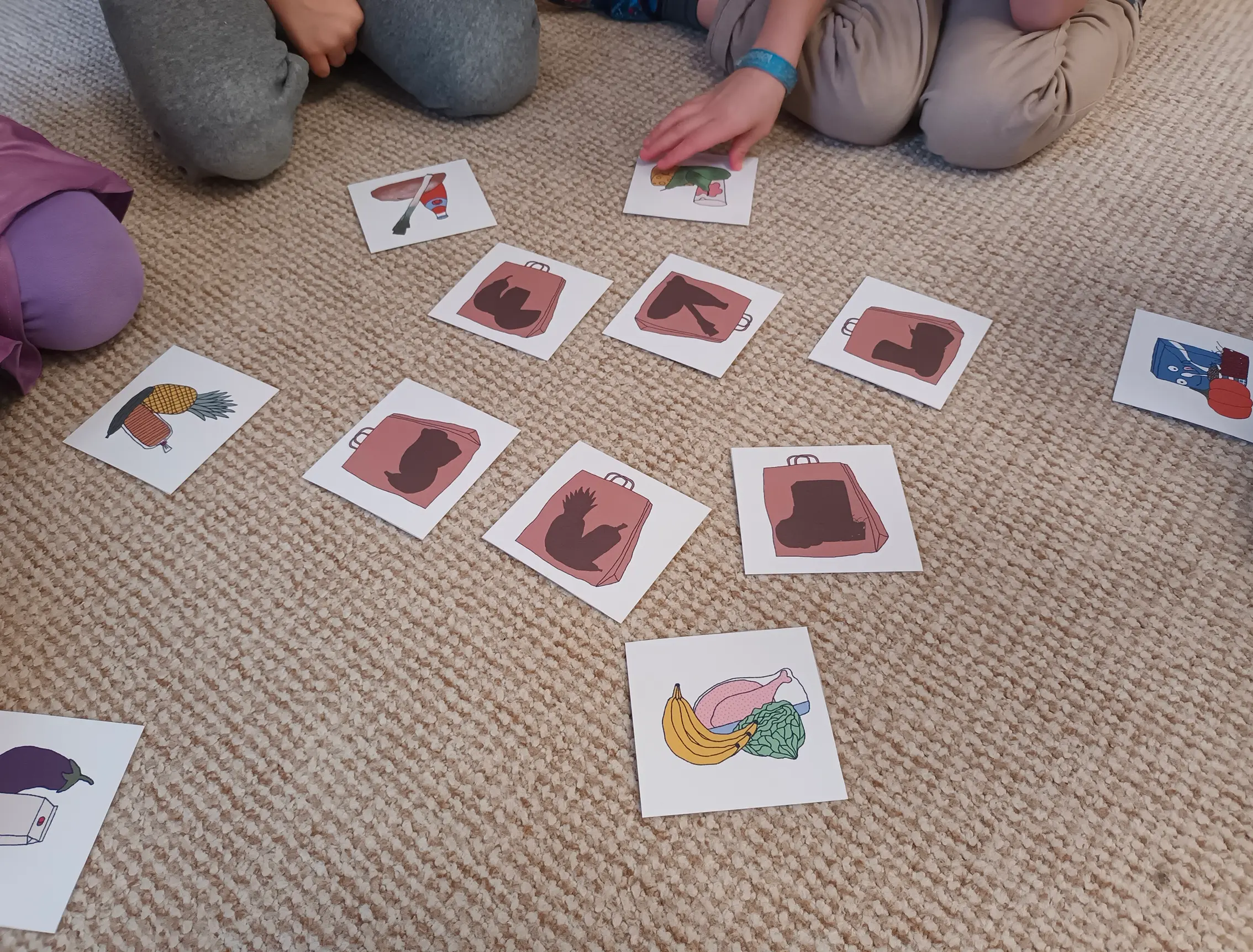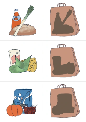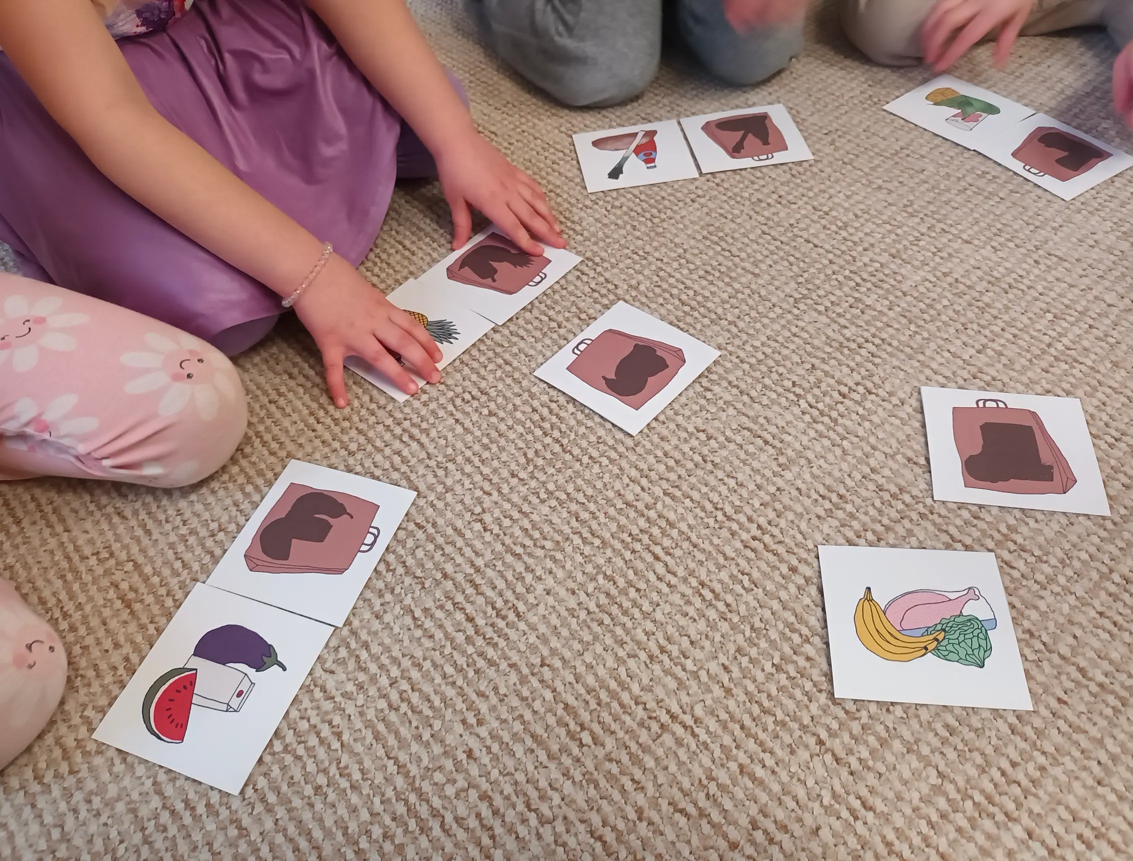 Rozstříháním obou listů získáme 6 dvojic obrázků. Prohlédneme si obsah hromádek potravin na kartičkách bez nákupních tašek a jednotlivé potraviny pojmenujeme. Můžeme si povědět o tom, kdo z nás už podobný nákup s rodiči někdy v obchodě pořídil, nebo jakou z jmenovaných potravin děti rády jedí. Pak se pustíme do práce a najdeme ke každé hromádce potravin obrázek papírové tašky, ve které se ukrývají stejné věci. Karty můžeme také využít ke hře pexesa.