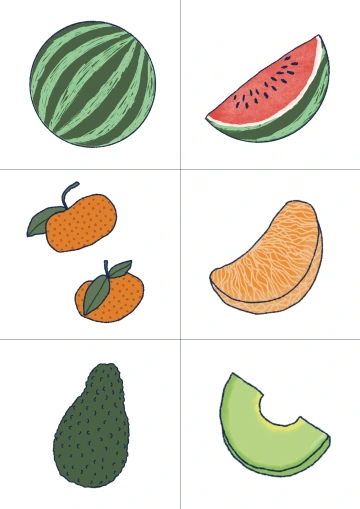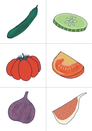 Povídáme si, v ideálním případě i sledujme, přivoníme a ochutnáváme, o tom, jak ovoce a zeleninu konzumujeme a jak se mění jejich podoba po rozkrojení. Uvědomujeme si, že některé ovoce a zeleninu pouze umyjeme a jíme celou. Některou musíme i oloupat, případně nakrájet. Společně si prohlédneme obrázky ovoce a zeleniny v celku i jejich částí. Pojmenujeme jednotlivé plody a jejich části (např. měsíček mandarinky, kolečko okurky). Všímáme si jejich barvy, tvaru i vnitřní struktury. Pomůcka je určena především pro mladší děti, které tvoří správné dvojice.