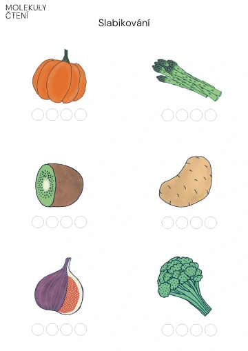 Pojmenujeme společně všechny obrázky a zeptáme se dětí, které z nich spadají do kategorie ovoce a které řadíme do zeleniny. Názvy všech potravin pak vytleskáme. Děti dostanou misku s malými knoflíčky, kamínky, čočkou apod. a samostatně jimi vyplní tolik koleček pod obrázkem, kolik vytleskaných slabik napočítaly. Hledáme nejkratší/nejdelší slovo a slova se stejným počtem slabik. Obrázky mohou sloužit i k určování první hlásky ve slově a tvorbě zdrobnělin.