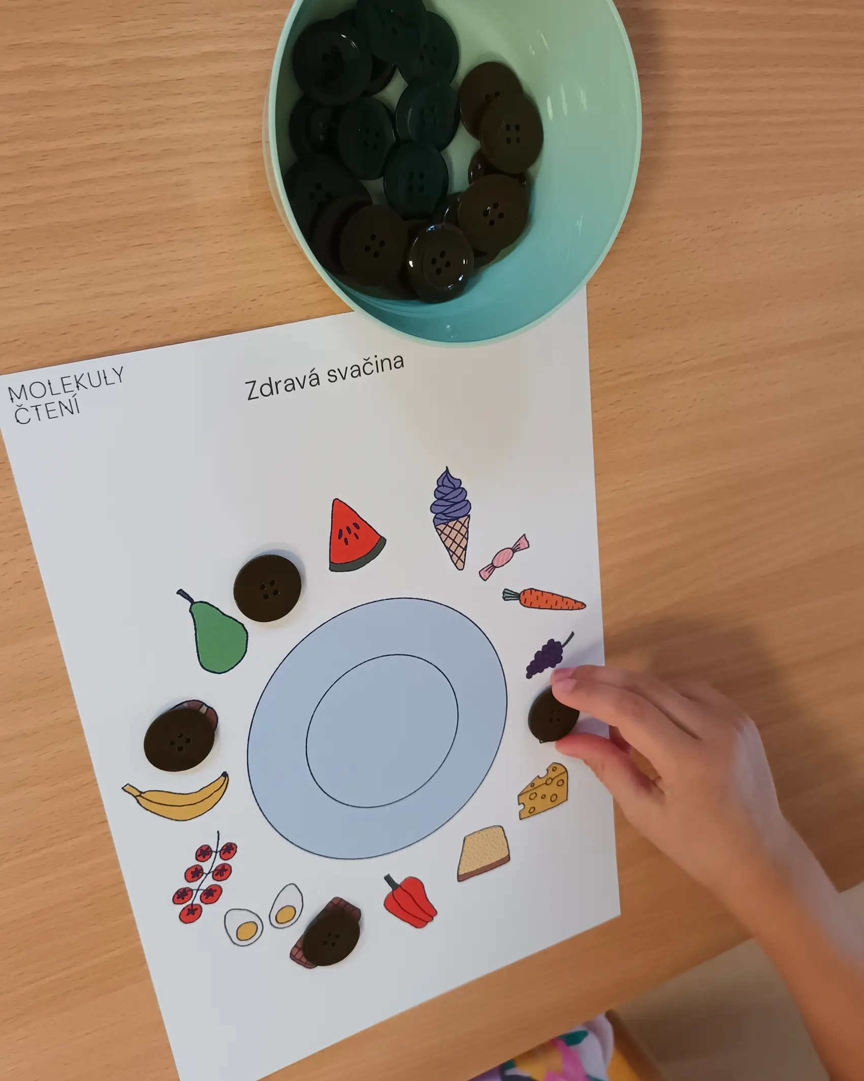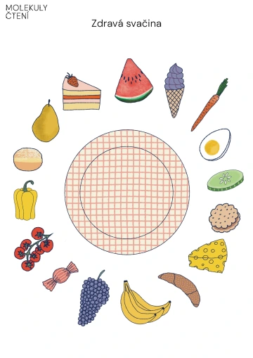 Prohlédneme a postupně pojmenujeme všechny vyobrazené věci kolem talíře. Společně přemýšlíme, které z jmenovaných potravin jsou pro nás zdravé, které méně, a které našemu zdraví naopak vůbec neprospívají. Na obrázky potravin, které jsou nezdravé, položíme kamínek nebo knoflík, tak aby se obrázek překryl. Tak nám zůstanou viditelné potraviny, které chceme na našem talíři vidět co nejčastěji. Dále diskutujeme o tom, jaké další potraviny, které kolem talíře nevidíme, jsou pro naše tělo zdravé a prospěšné a proč. Zamyslíme se nad tím, kdy a jak často si můžeme dopřát méně zdravé potraviny a jaký je důvod, proč to s nimi není radno přehánět.