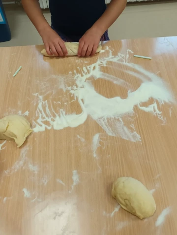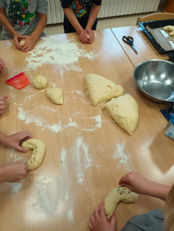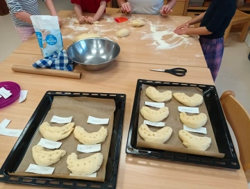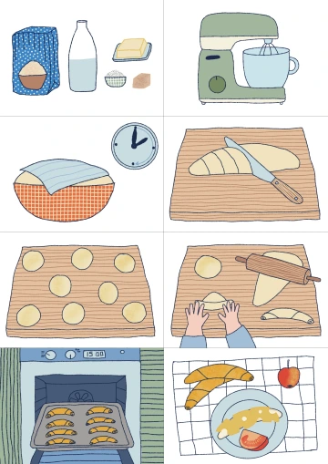 Společně si prohlédneme jednotlivé kartičky znázorňující postup pečení rohlíků a pojmenujeme, co se na nich děje. Od přípravy surovin přes zadělání a tvarování těsta až po samotné pečení a přípravy chutné svačinky. Děti mohou pracovat s plakátkem jako oporou, nebo si jednotlivé kartičky samostatně seřadí podle správné časové posloupnosti. Vedeme je k tomu, aby jednotlivé kroky popsaly vlastními slovy a zdůvodnily, proč daný krok následuje právě po předchozím. Aktivitu lze realizovat společně v kruhu i jako samostatnou či skupinovou práci. V ideálním případě ji propojíme s praktickou zkušeností s přípravou těsta a pečením, viz nabízená činnost v centru - Pečeme rohlíky.