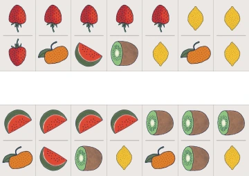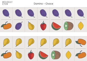 Kartičky si s dětmi společně prohlédneme a pojmenujeme jednotlivé druhy ovoce. Povídáme si o tom, čím se od sebe liší – barvou, tvarem, velikostí, povrchem či chutí. Vysvětlíme si jednoduchá pravidla hry domino a názorně ukážeme, jak k sobě kartičky přikládáme tak, aby na sebe navazovaly stejné druhy ovoce. Dětem předvedeme, jak tvoříme dvojice a jak postupně vzniká „cestička“ z kartiček. Zmíníme, že výsledný tvar cesty může být pokaždé jiný podle toho, jak hráči kartičky skládají.