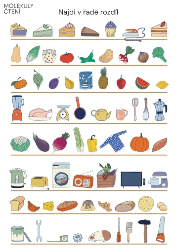 Prohlédneme si jednotlivé řady předmětů a pojmenujeme sortiment z různých druhů obchodů. Povídáme si o tom, kde bychom dané zboží mohli koupit a k čemu slouží. V každé řadě je jeden předmět, který do daného sortimentu nepatří. Děti tento odlišný předmět vyhledají a označí například barevným párátkem nebo jiným drobným materiálem. Svůj výběr zdůvodní a vysvětlí, v čem se daný předmět liší. Dále můžeme s jednotlivými řadami pracovat i matematicky. Děti odhadují, zda je v řadě více či méně předmětů než prstů na jedné či obou rukou, následně je spočítáme a společně ověříme správnost odhadu.
