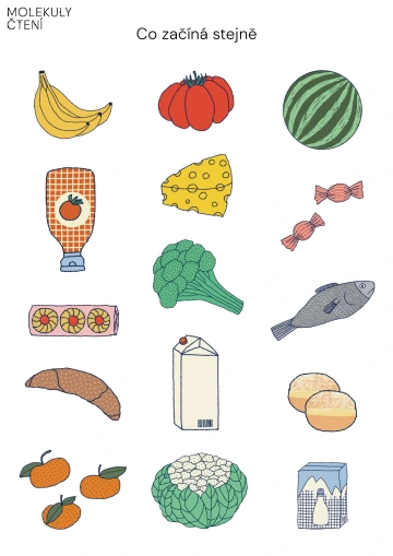 Společně si prohlédneme list se třemi sloupci vyobrazených potravin a pojmenujeme je. Zaměříme se na jejich počáteční hlásku a vyslovíme ji zřetelně. Úkolem dětí je vyhledat potraviny, které začínají na stejnou hlásku a označit je zvoleným způsobem např. trojice stejných knoflíků či figurek. V každém sloupci je vždy jedna potravina určité hlásky. Kolik trojic jsme vytvořili? Na pomůcce můžeme procvičit také znalost řádků a sloupců, tím že se dětí ptáme: Jaká potravina se nachází v prvním řádku jako druhá, Jaká zelenina je třetí v druhém sloupci apod.