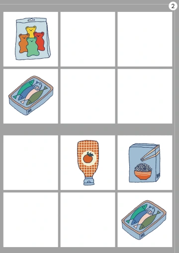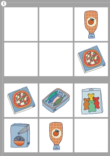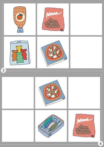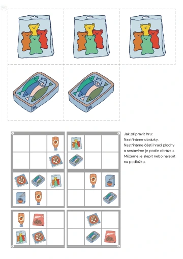 Společně si prohlédneme obrázky potravin v obalech a pojmenujeme je. Povídáme si o tom, při jaké příležitosti bychom je mohli využít, například k večeři, obědu, na mlsaní apod. Vysvětlíme si a názorně ukážeme, jak pracujeme s kartičkami na hrací ploše sudoku. Připomeneme si, co je řádek a co sloupec, a ukážeme si, jak se na ploše orientovat. Upozorníme děti, že v každém řádku i sloupci se stejný obrázek může objevit pouze jednou. Vysvětlíme, že hra je určena pro jednoho hráče a cílem je zaplnit celou hrací plochu tak, aby se žádná potravina v řádku ani sloupci neopakovala a žádné políčko nezůstalo prázdné. Děti vedeme k systematickému postupu, samostatnosti a kontrole správnosti.